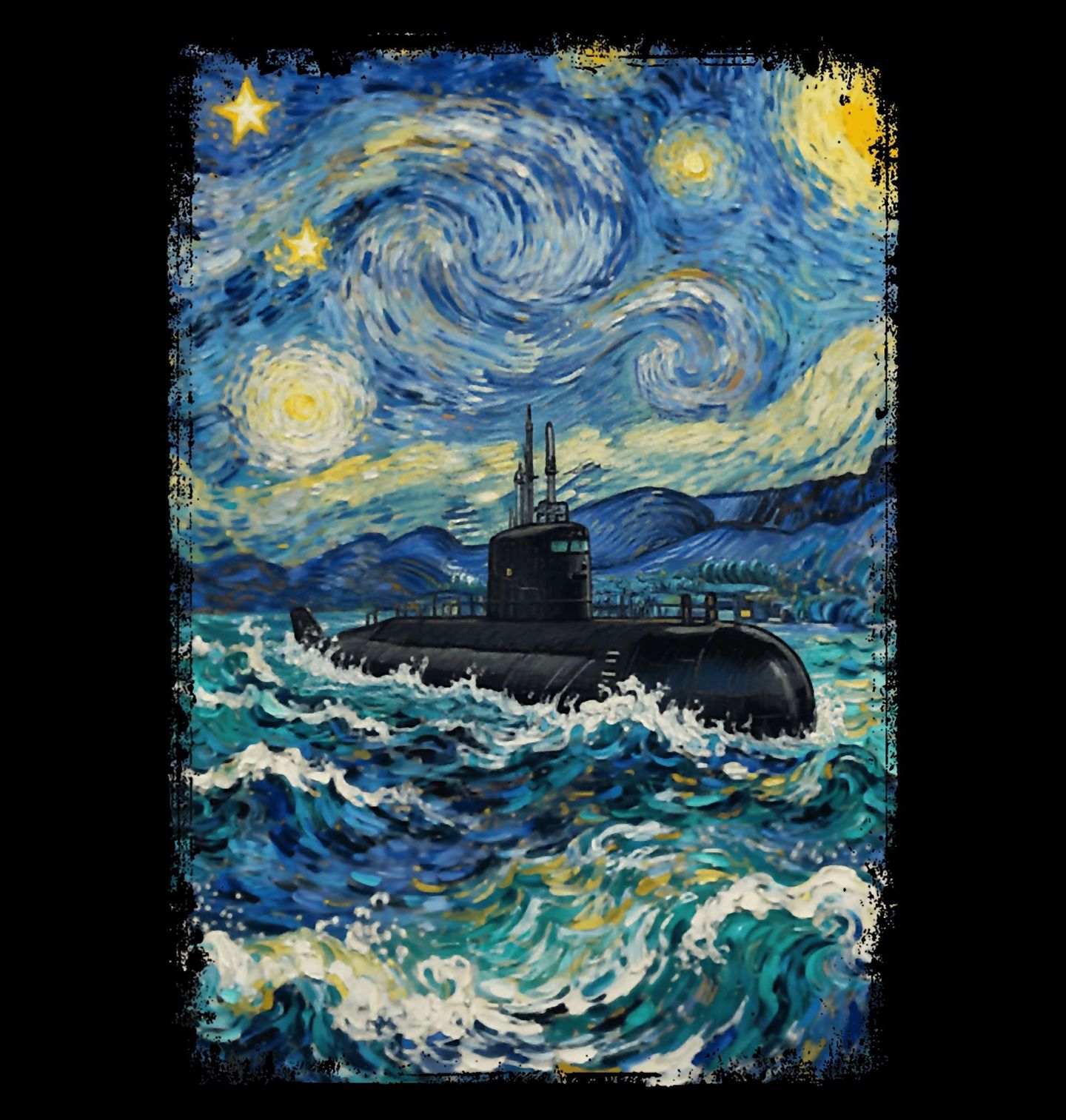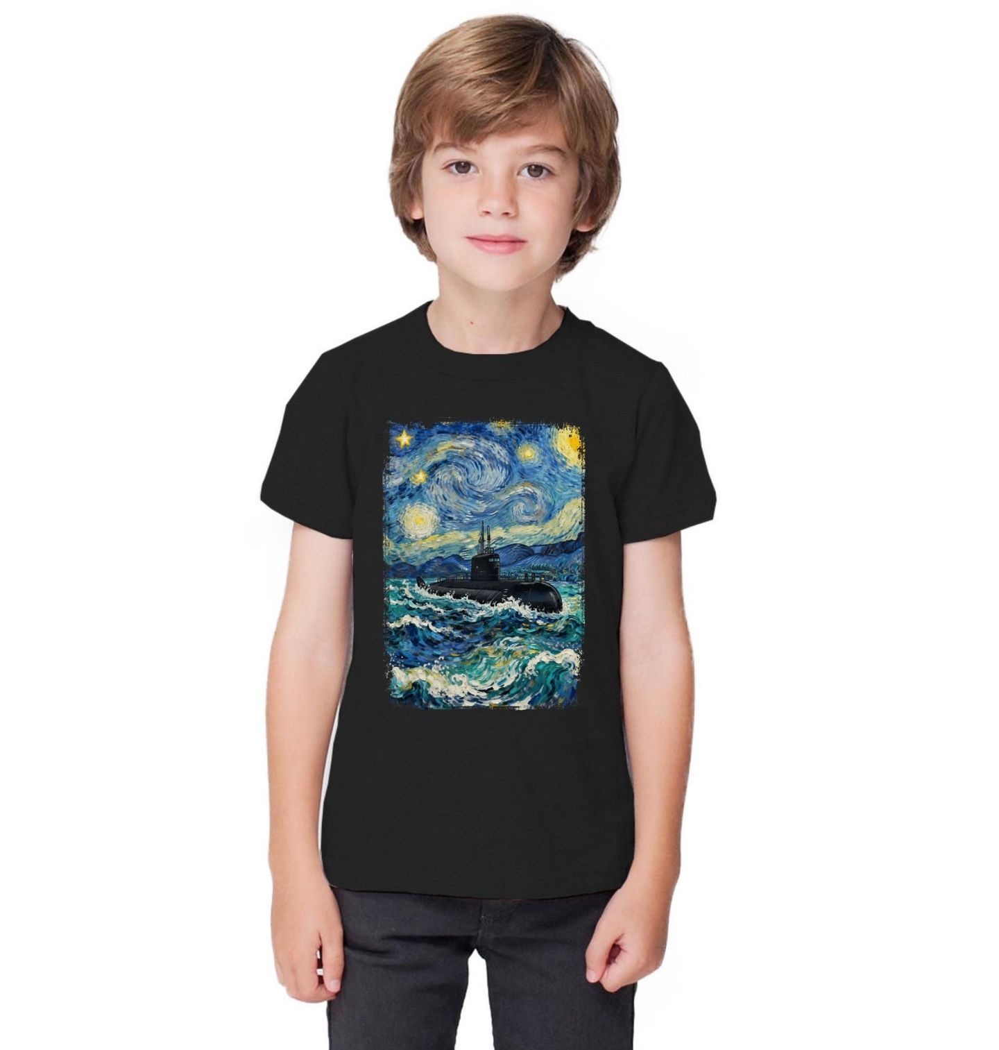 Dětské tričko Ponorka ve Hvězdné noci. Originální motiv, který propojuje slavný obraz Hvězdná noc a malířský styl Vincenta van Gogha s tematikou moře a techniky. Uprostřed rozbouřených vln se nese tmavá ponorka, která působí, jako by patřila do světa, kde se setkává umění a armáda.