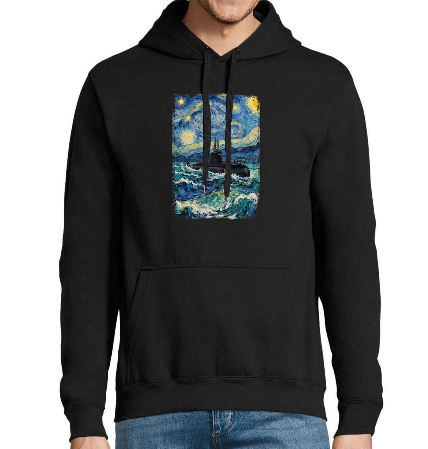 Pánská mikina Ponorka ve Hvězdné noci. Originální motiv, který propojuje slavný obraz Hvězdná noc a malířský styl Vincenta van Gogha s tematikou moře a techniky. Uprostřed rozbouřených vln se nese tmavá ponorka, která působí, jako by patřila do světa, kde se setkává umění a armáda.