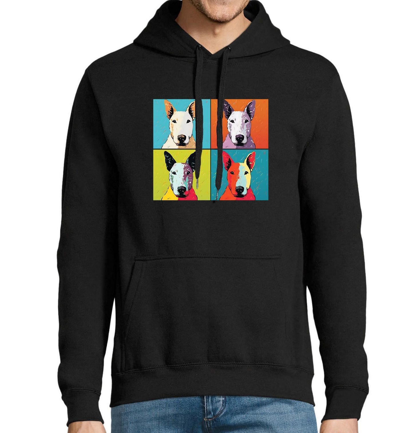 Pánská mikina Pop-art Anglický bulteriér. Tento pes potěší každého, kdo miluje plemeno Anglický bulteriér, je zapálený pejskař nebo jen milovník umění. Barevná čtveřice pohledů na tohoto ikonického psa ti připomene jeho nebojácnou, věrnou i trochu drzou povahu – přesně tak, jak ho známe.