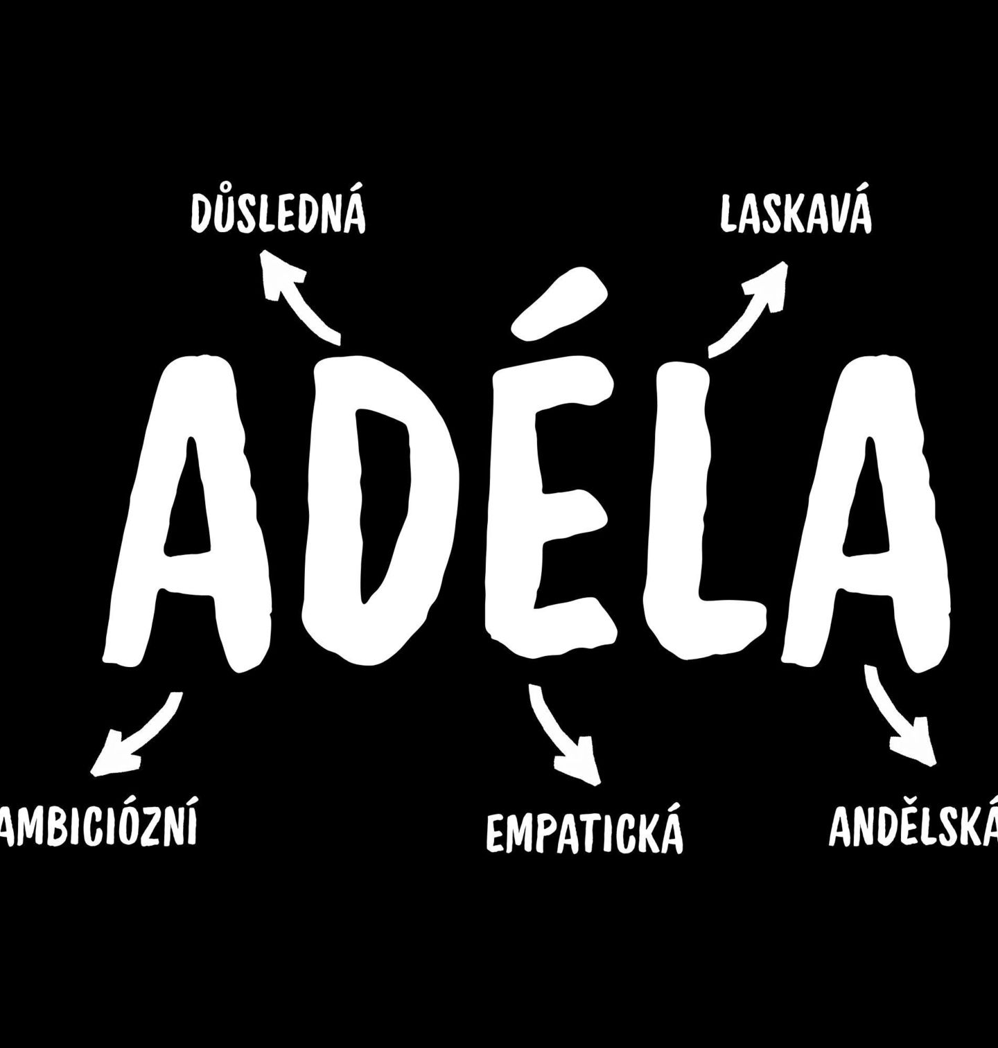Dámské tričko Popis Jména Adéla. Originální motiv se jménem Adéla, který vystihuje osobnost i charakter a je ideální jako dárek na svátek, narozeniny nebo jen tak pro radost, jméno Adéla zde reprezentuje vlastnosti, které ji dokonale popisují: důsledná, laskavá, ambiciózní, empatická, andělská, tento design je skvělou volbou pro každou Adélu, která chce ukázat, jaká opravdu je a co její jméno znamená.