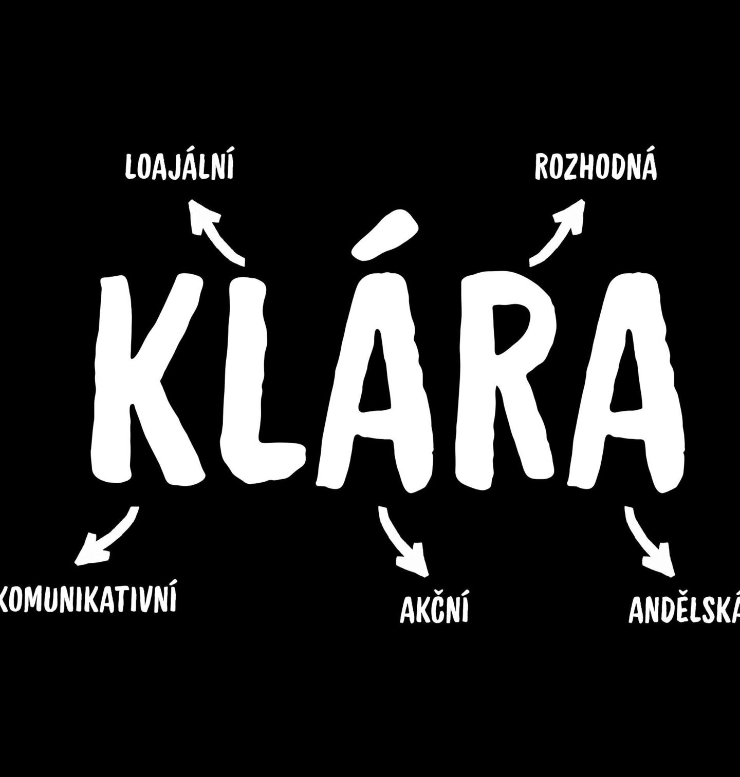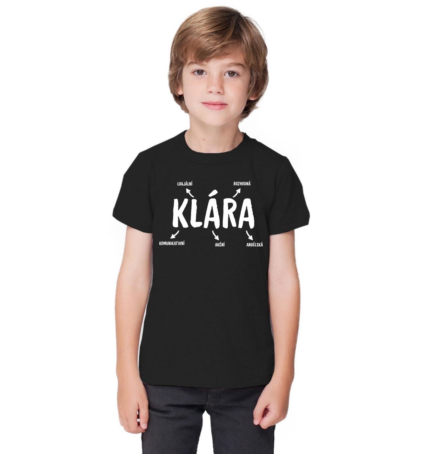 Dětské tričko Popis Jména Klára. Originální motiv se jménem Klára, který vystihuje osobnost i charakter a je ideální jako dárek na svátek, narozeniny nebo jen tak pro radost, jméno Klára zde reprezentuje vlastnosti, které ji dokonale popisují: loajální, rozhodná, komunikativní, akční, andělská.