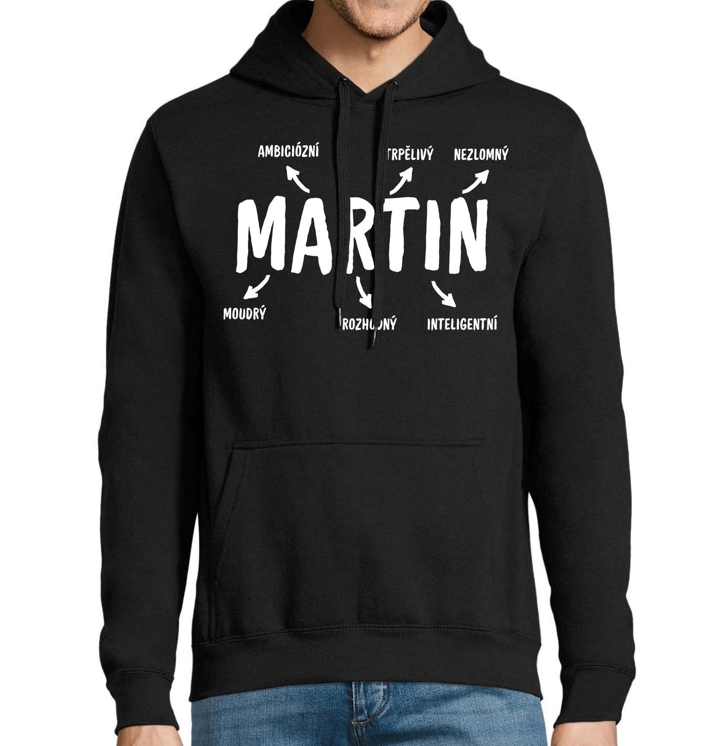 Pánská mikina Popis Jména Martin. Originální motiv se jménem Martin, který v sobě spojuje charakter, sílu i osobnost, ideální jako stylový dárek na svátek, narozeniny nebo jen tak pro radost každému, kdo nese jméno Martin, tento design vystihuje vlastnosti, které Martina definují: ambiciózní, trpělivý, nezlomný, moudrý, rozhodný, inteligentní.