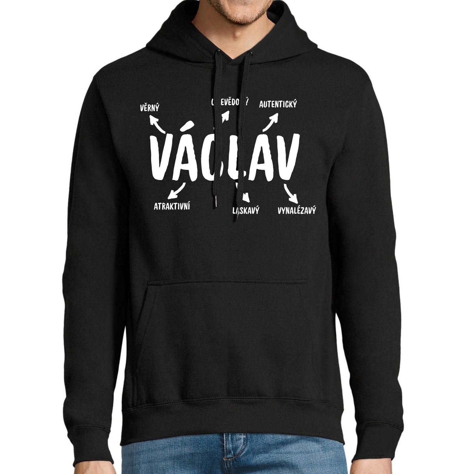 Pánská mikina Popis Jména Václav. Stylový motiv se jménem Václav, který vystihuje osobnost a charakter, ideální jako dárek na svátek, narozeniny nebo jako originální překvapení, jméno Václav zde symbolizuje vlastnosti, které ho dokonale popisují: věrný, cílevědomý, autentický, atraktivní, laskavý, vynalézavý.