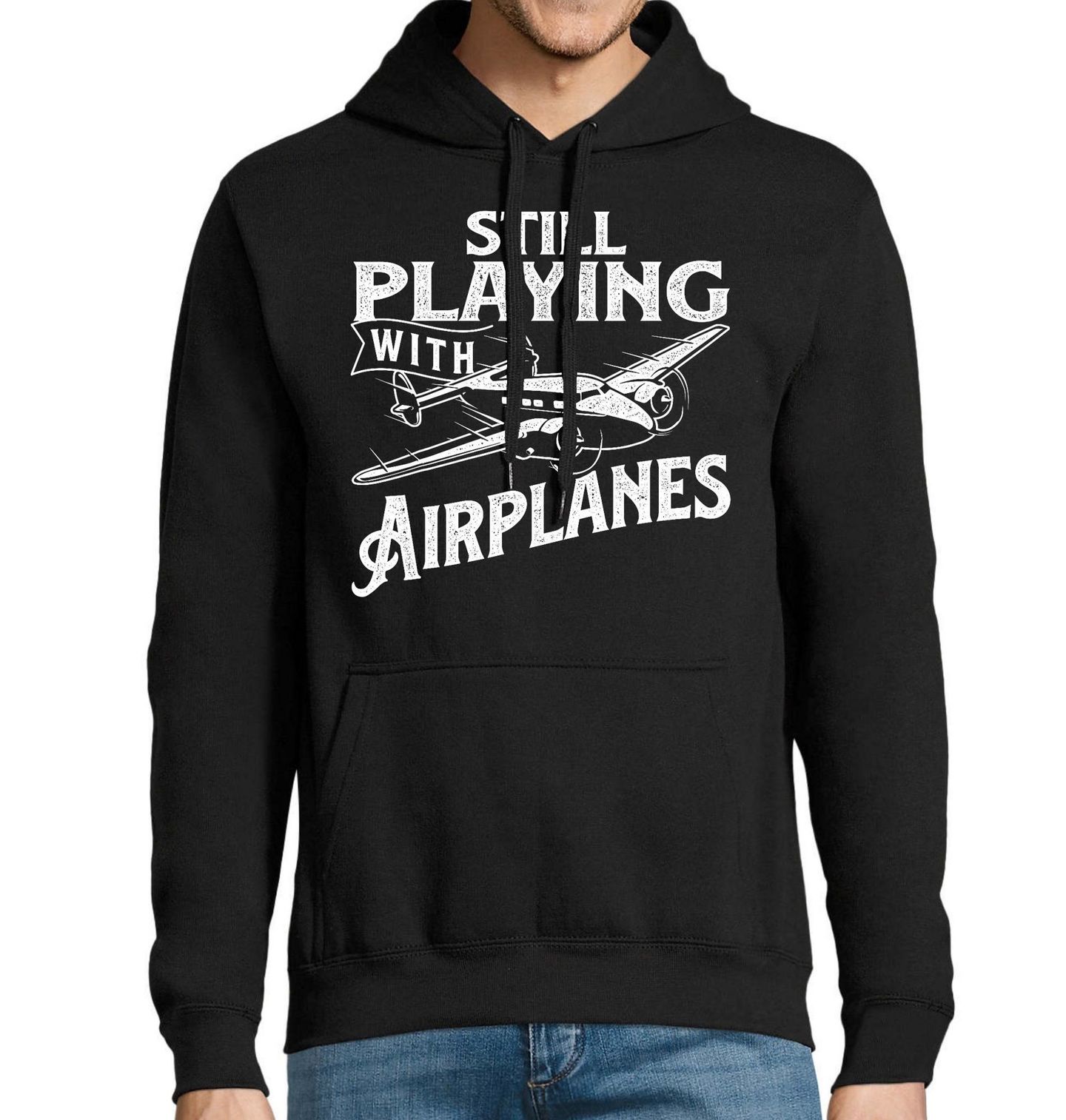 Pánská mikina Pořád si Hraji s Letadly. Retro motiv s obrázkem letadla obsahuje text „STILL PLAYING WITH AIRPLANES“, tedy „Pořád si hraju s letadly“. Ideální pro všechny, kdo si zachovali dětskou vášeň pro létání.