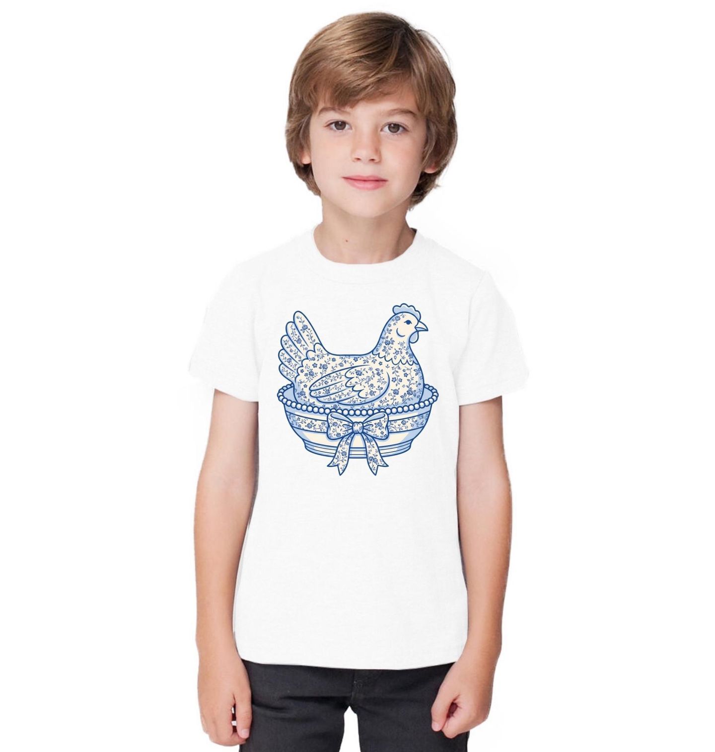 Dětské tričko Porcelánová Slepice Folk. Detailní květinové vzory a modrobílé ladění dodávají designu nádech lidového umění a vytváří harmonický folk vzhled. Slepice je stylizovaná tak, aby evokovala ručně zdobenou kraslice, což přináší do motivu lehkost, tradici i krásu venkovského života. Celková kompozice působí klidně a vkusně, jako by pocházela z prostředí staré farma.