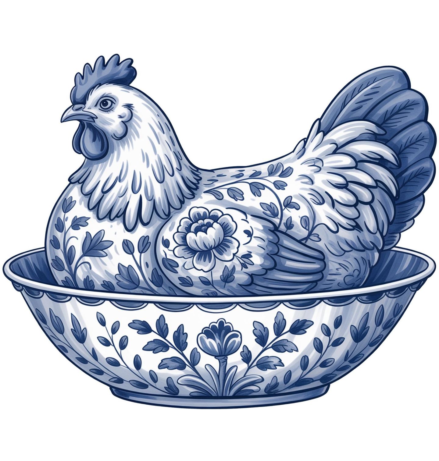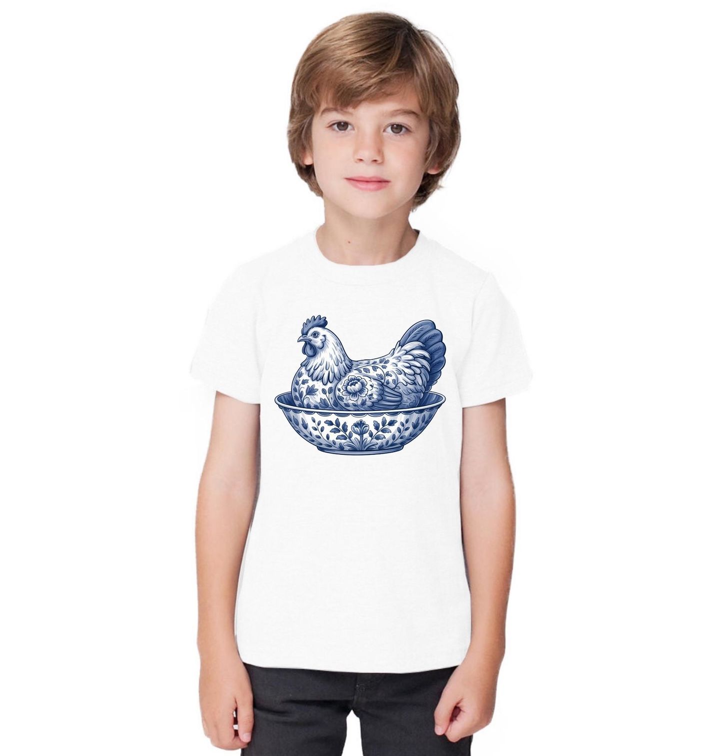 Dětské tričko Porcelánová Slepice v Misce Folk. Elegantní motiv zobrazuje slepice v detailním modrobílém stylu inspirovaném tradičním porcelán. Jemné květinové ornamenty a precizní linie dodávají designu nadčasovou krásu a jedinečný nádech lidového umění ve stylu folk. Slepice je zasazená do dekorativní misky, což vytváří harmonickou kompozici připomínající starožitný porcelánový kousek.