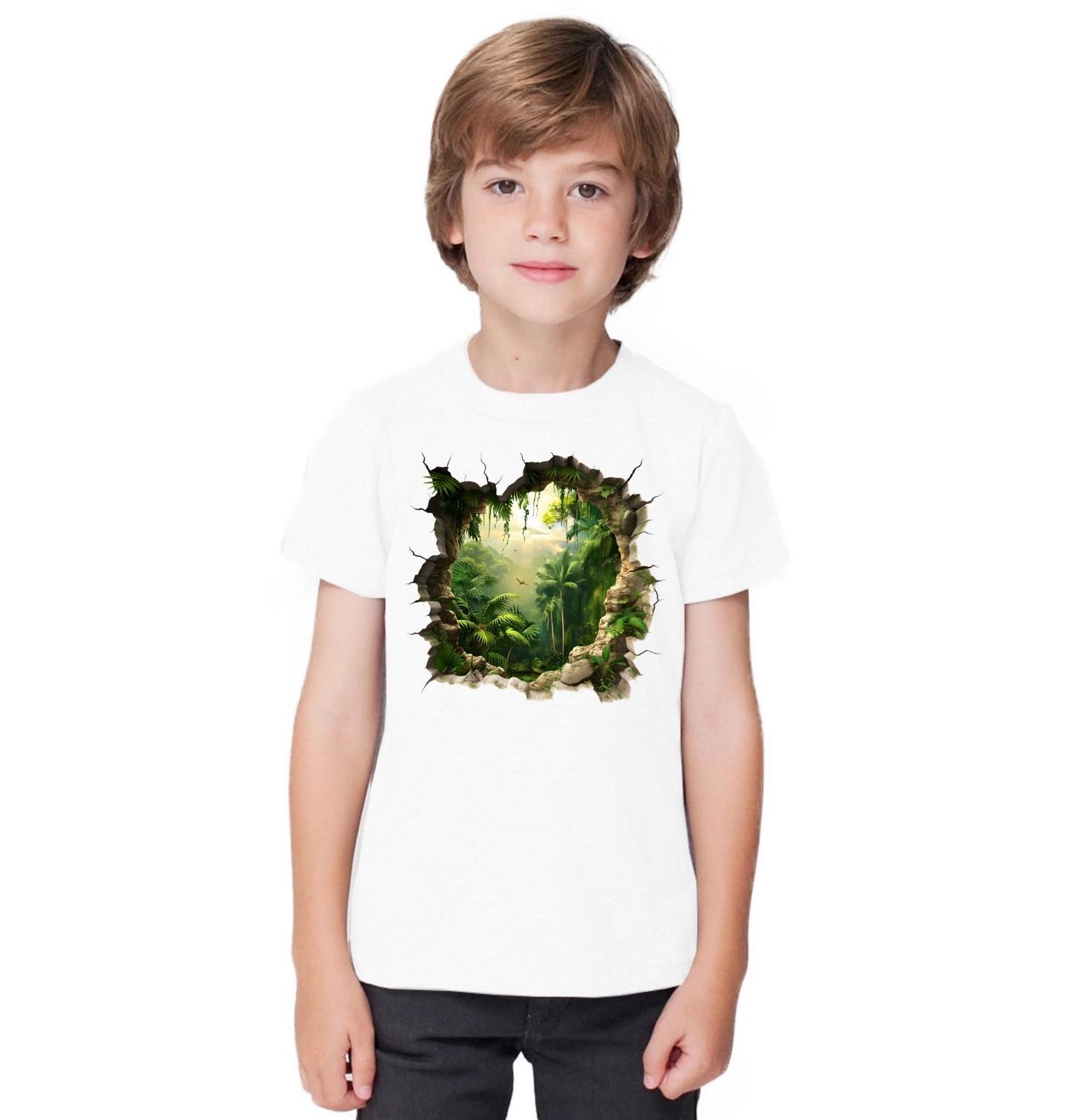 Dětské tričko Portál do Džungle 3D. Originální motiv s realistickým efektem průlomu, který odhaluje tajemnou džungle plnou zeleně, světla a života. Tento vizuální efekt vytváří iluzi, jako bys nahlížela skrz zeď přímo do tropického ráje. Detailně zpracovaná džungle s palmami, liánami a jemným světlem dodává motivu hloubku a klidnou atmosféru.