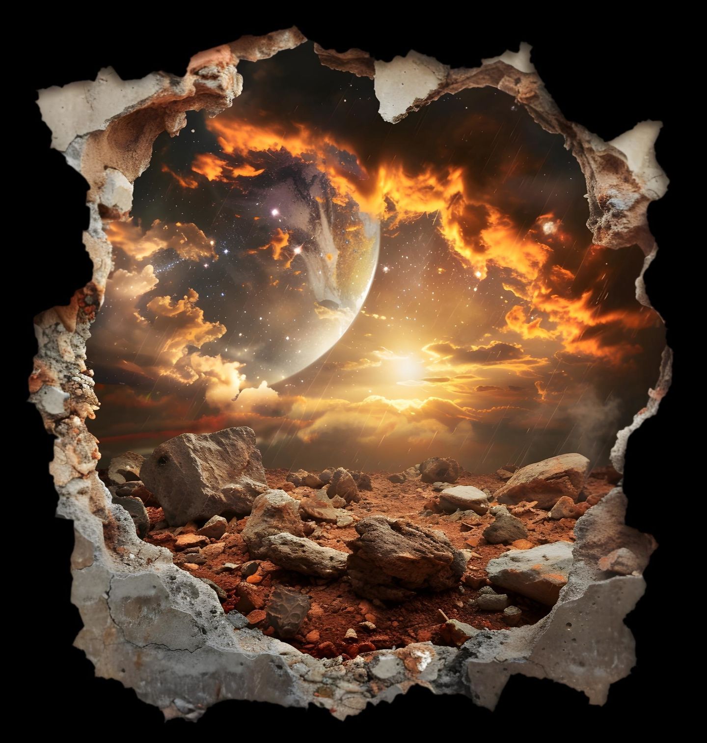 Pánské tričko Portál do Jiné Dimenze 3D. Design vytváří iluzi roztržené reality, kde se za kamenitou krajinou otevírá fascinující vesmír plný světla, planet a energie. Kombinace přírodních prvků jako skála, kameny a hora s mystickým kosmickým pozadím dodává motivu hloubku a silnou atmosféru. Tento vizuální efekt působí jako vstup do jiné dimenze, kde se setkává země a vesmír v jednom dechberoucím okamžiku.