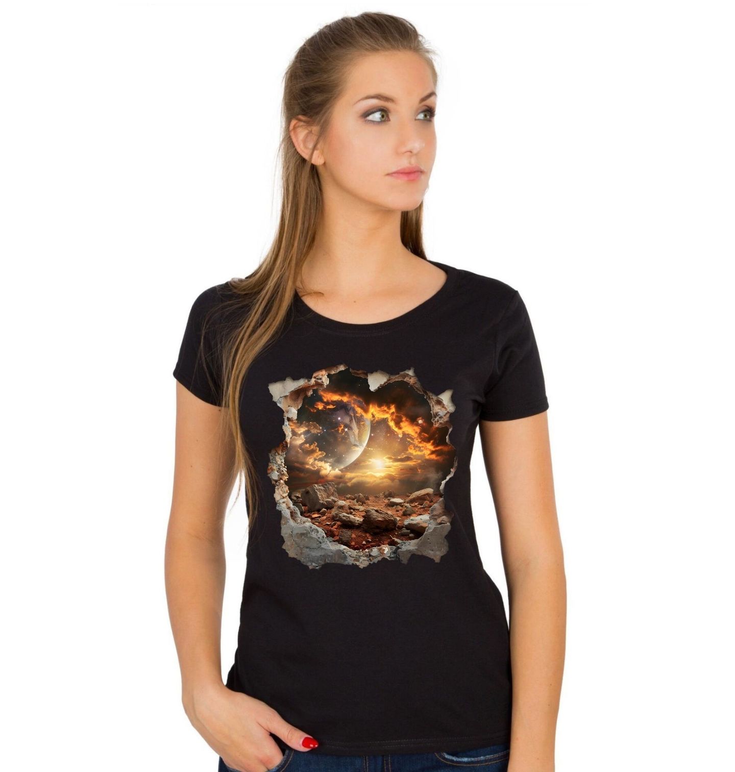 Dámské tričko Portál do Jiné Dimenze 3D. Design vytváří iluzi roztržené reality, kde se za kamenitou krajinou otevírá fascinující vesmír plný světla, planet a energie. Kombinace přírodních prvků jako skála, kameny a hora s mystickým kosmickým pozadím dodává motivu hloubku a silnou atmosféru. Tento vizuální efekt působí jako vstup do jiné dimenze, kde se setkává země a vesmír v jednom dechberoucím okamžiku.