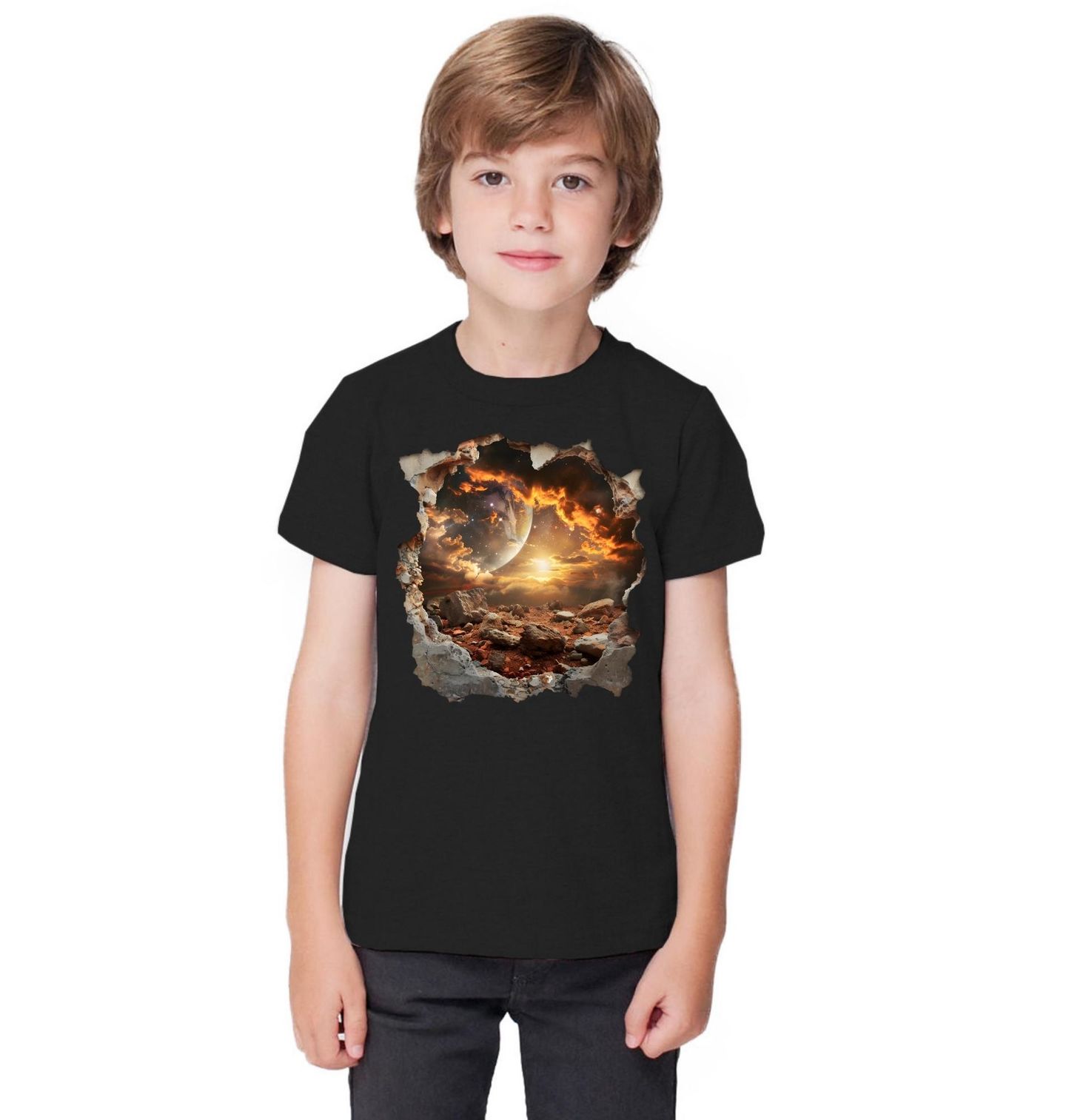 Dětské tričko Portál do Jiné Dimenze 3D. Design vytváří iluzi roztržené reality, kde se za kamenitou krajinou otevírá fascinující vesmír plný světla, planet a energie. Kombinace přírodních prvků jako skála, kameny a hora s mystickým kosmickým pozadím dodává motivu hloubku a silnou atmosféru. Tento vizuální efekt působí jako vstup do jiné dimenze, kde se setkává země a vesmír v jednom dechberoucím okamžiku.