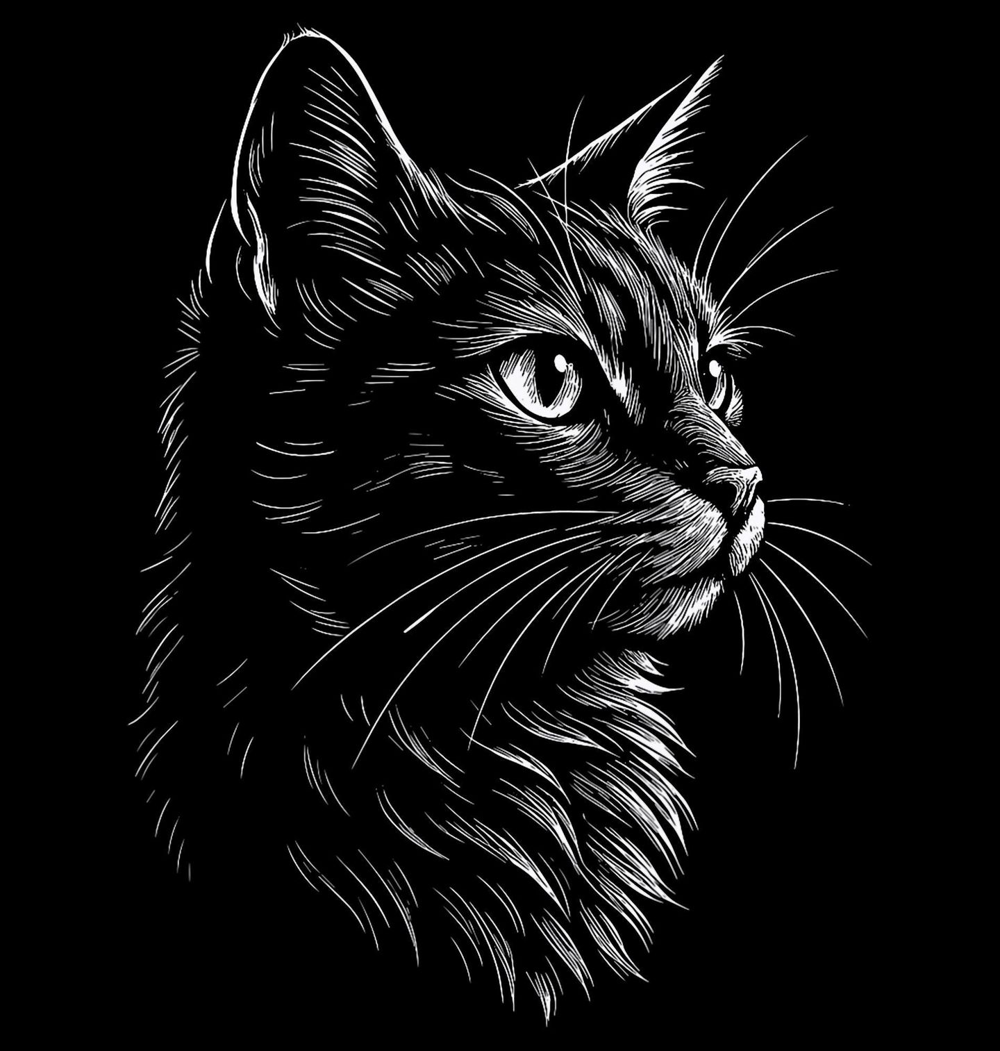 Pánská mikina Portrét Kočky Scratch Art. Stylový motiv, na kterém je zobrazená kočka v elegantním černobílém provedení. Detailní kresba jemných linek působí jako linoryt nebo škrábaná grafika a zvýrazňuje výraz očí i strukturu srsti. Minimalistický kontrast černého pozadí a bílých linií dodává motivu tajemný a noblesní vzhled.