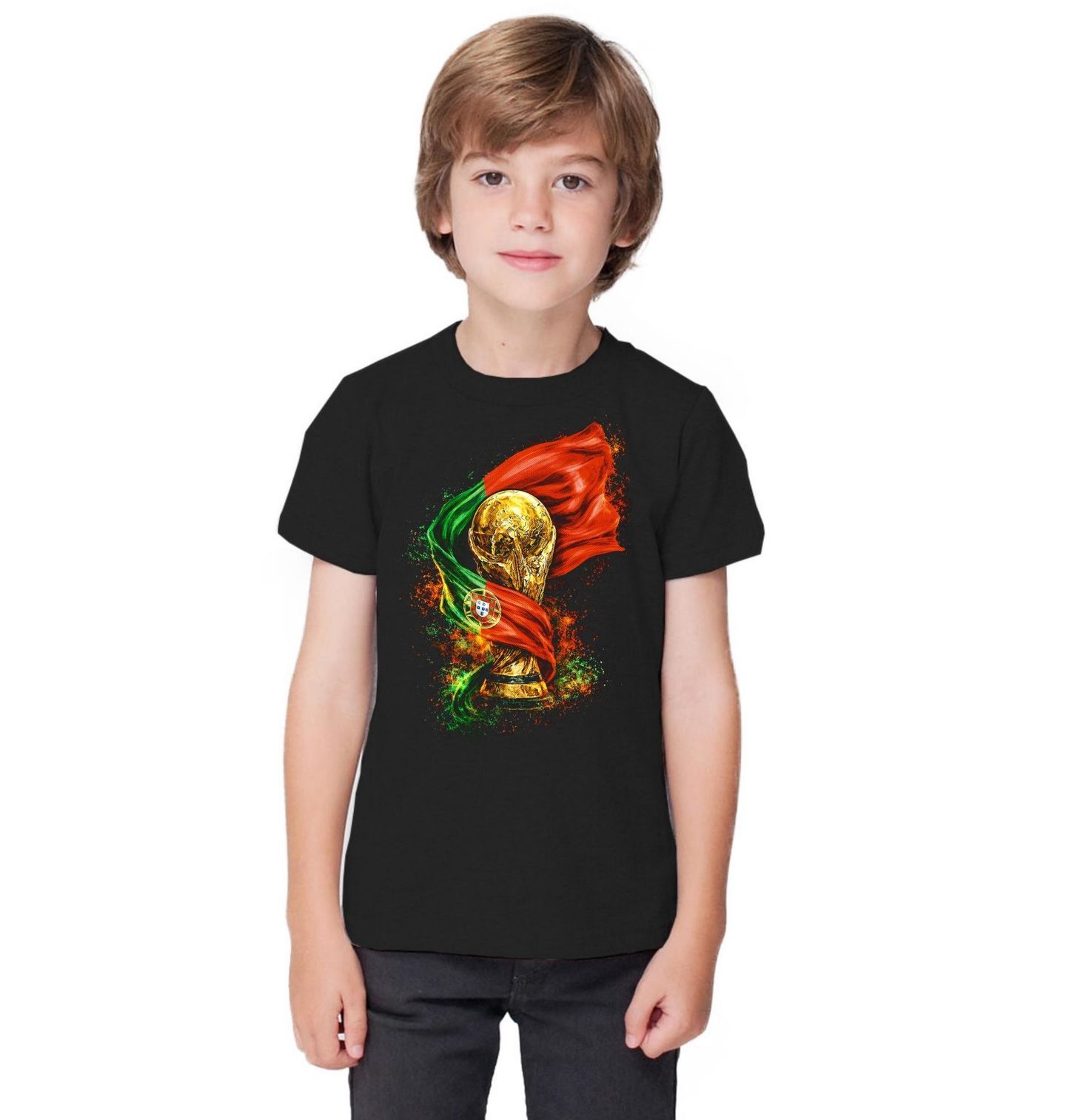 Dětské tričko Portugalská Trofej FIFA World Cup. Kombinace zelené a červené barvy spolu s národním znakem symbolizuje vášeň, tradici a odhodlání portugalského fotbalu. Zlatý pohár v kontrastu s dynamickým pozadím vytváří silný a energický design, který osloví každého fanouška. Výrazný motiv zachycuje ikonickou trofej Mistrovství světa ve fotbale obklopenou vlajkou, kterou má Portugalsko.