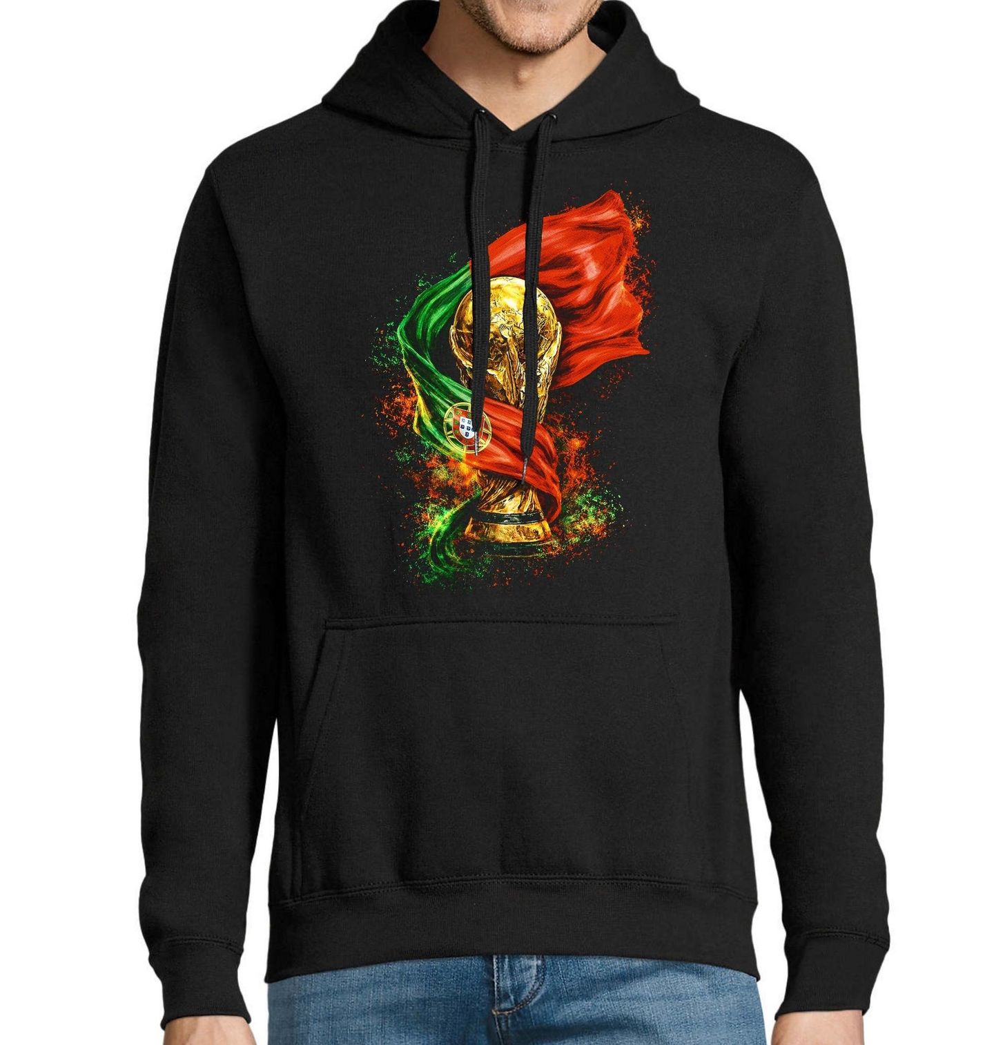 Pánská mikina Portugalská Trofej FIFA World Cup. Kombinace zelené a červené barvy spolu s národním znakem symbolizuje vášeň, tradici a odhodlání portugalského fotbalu. Zlatý pohár v kontrastu s dynamickým pozadím vytváří silný a energický design, který osloví každého fanouška. Výrazný motiv zachycuje ikonickou trofej Mistrovství světa ve fotbale obklopenou vlajkou, kterou má Portugalsko.