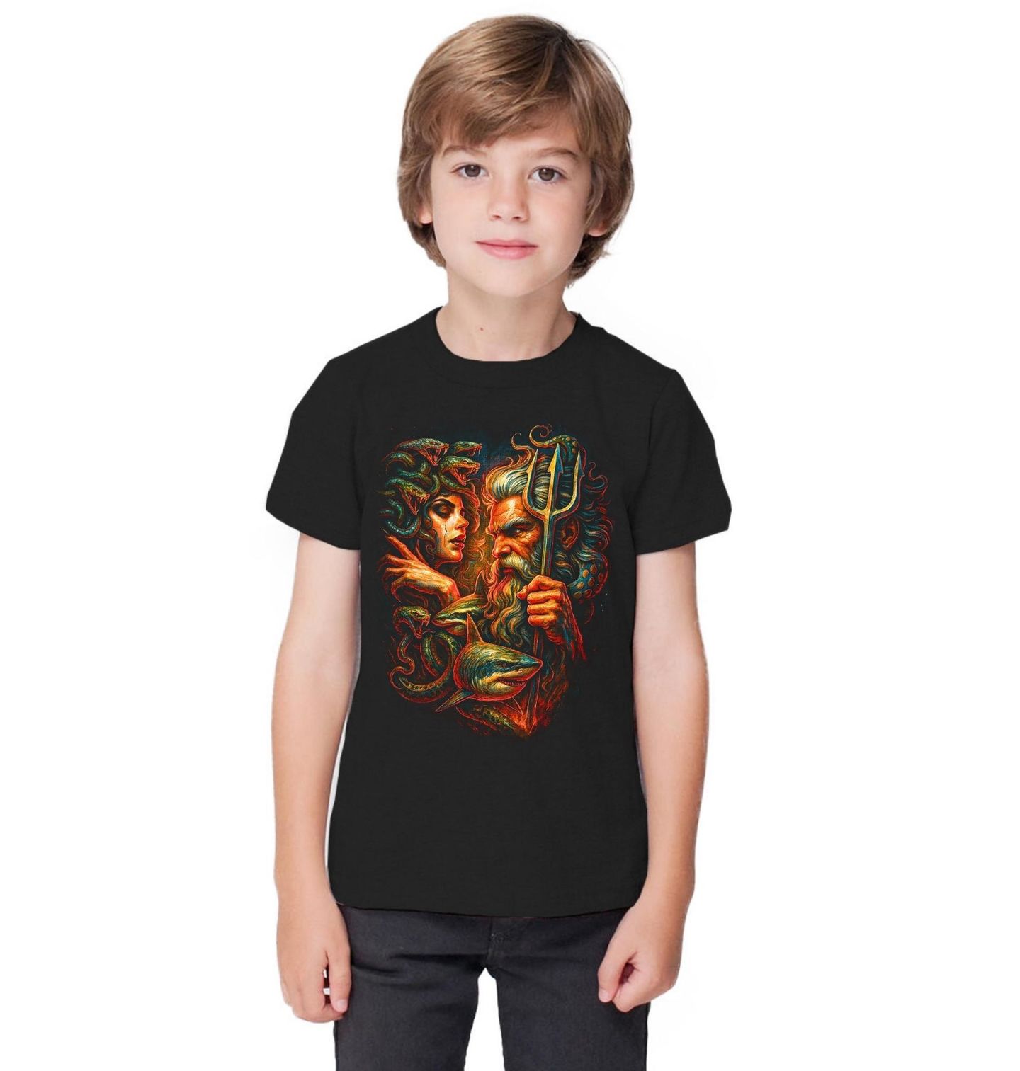 Dětské tričko Poseidón a Medúza. Poseidón je v řecké mytologii bohem moří, zemětřesení a koní. Jeho trojzubec představuje absolutní moc nad vodním živlem. Naproti němu Medúza s hady místo vlasů, bytost zahalená temnotou, jejíž pohled dokáže proměnit v kámen. Medúza, jedna z Gorgon, je symbolem osudovosti, ochrany i ničivé síly. Společně vytvářejí silný kontrast mezi hlubinou oceánu a temnou magií mýtických bytostí.