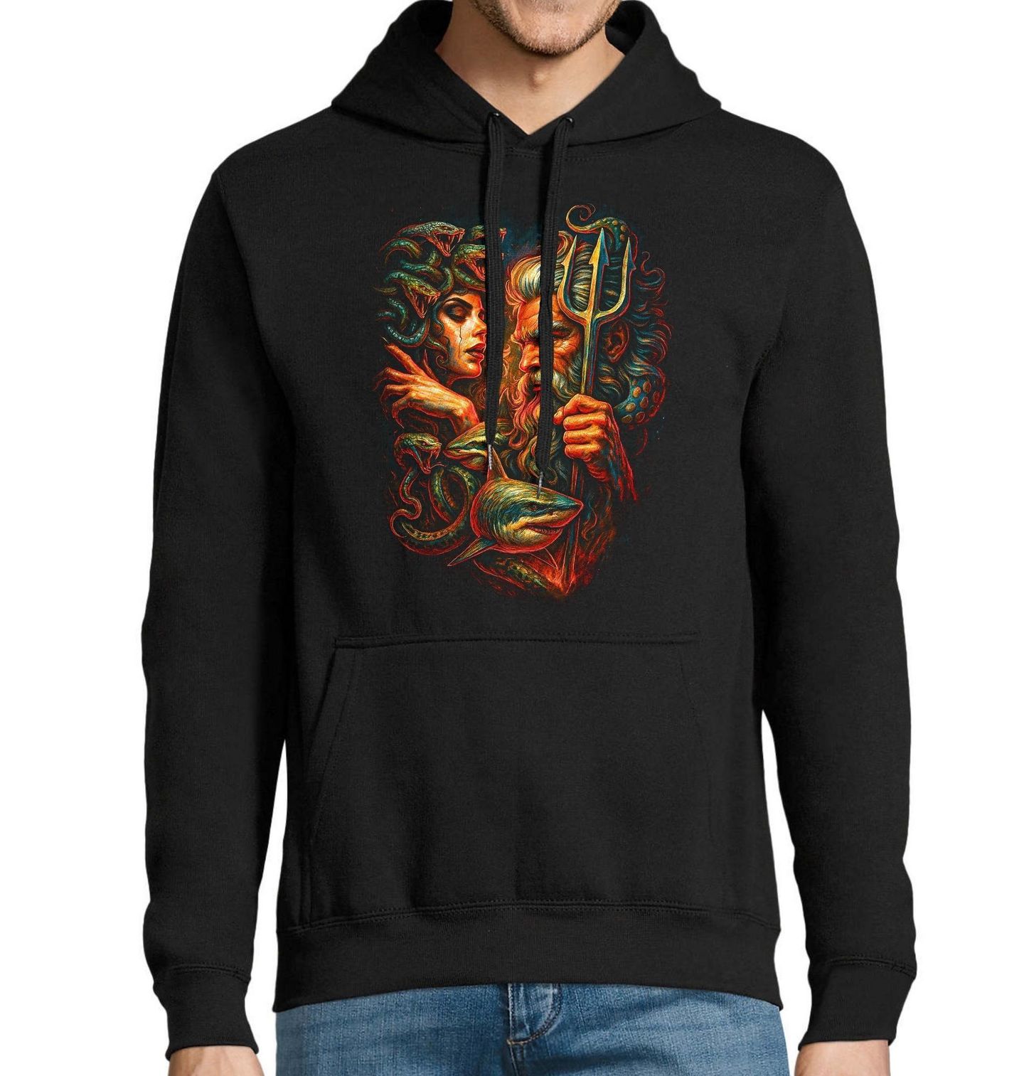 Pánská mikina Poseidón a Medúza. Poseidón je v řecké mytologii bohem moří, zemětřesení a koní. Jeho trojzubec představuje absolutní moc nad vodním živlem. Naproti němu Medúza s hady místo vlasů, bytost zahalená temnotou, jejíž pohled dokáže proměnit v kámen. Medúza, jedna z Gorgon, je symbolem osudovosti, ochrany i ničivé síly. Společně vytvářejí silný kontrast mezi hlubinou oceánu a temnou magií mýtických bytostí.