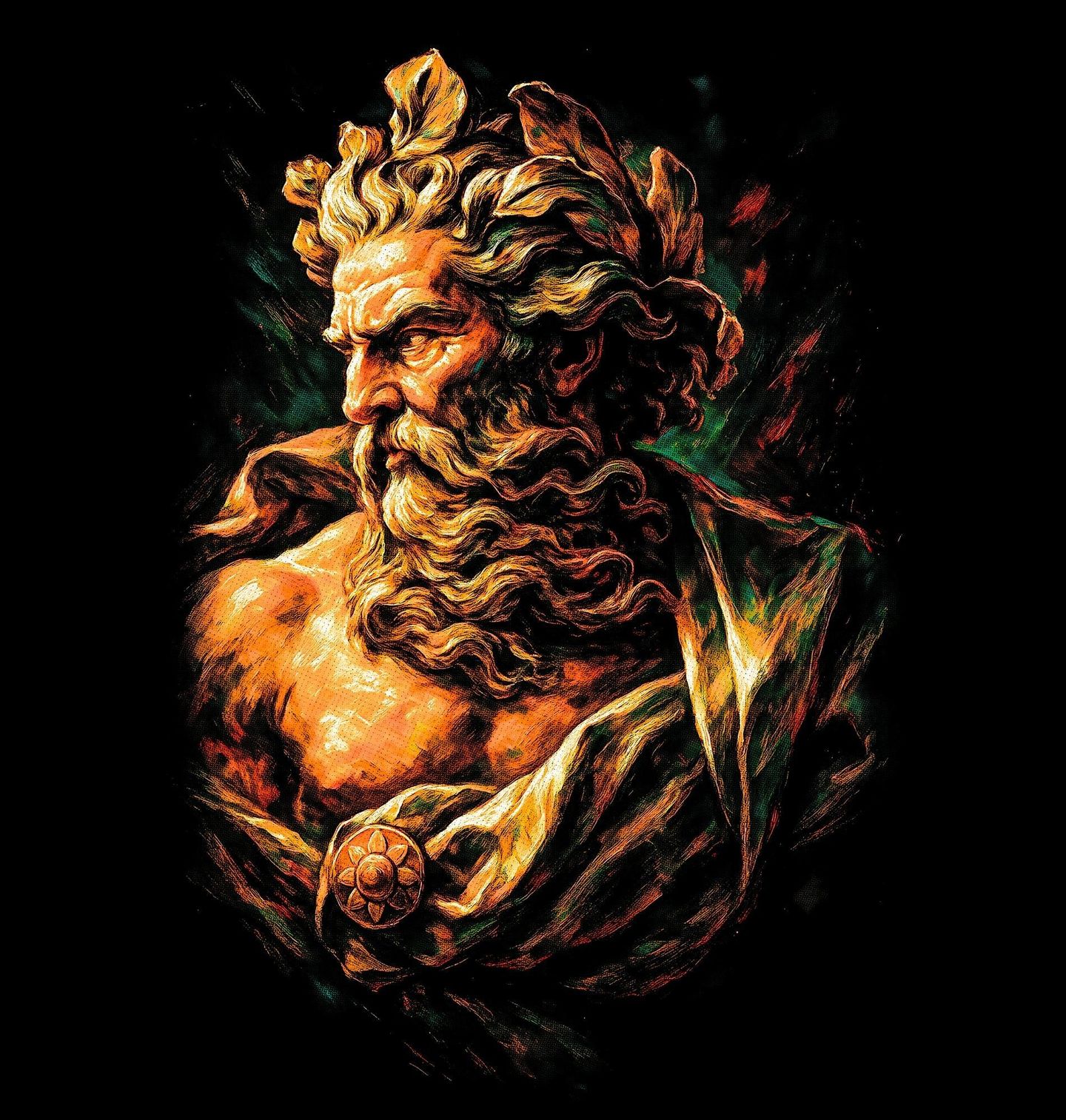 Dětské tričko Poseidón Vládce Hlubin. Poseidon je v řecké mytologii vládcem všech vod, patronem námořníků a pánem zemětřesení. Bratr Dia a Háda patří mezi nejmocnější bohy Olympu. Symbolizuje nespoutanou přírodní sílu, hloubku, tajemství a respekt, který si příroda zaslouží. Teplé zlatavé tóny a sochařský styl dodávají motivu nadčasový vzhled inspirovaný antickým uměním.