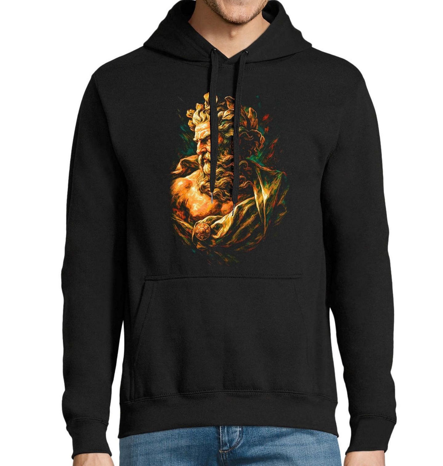 Pánská mikina Poseidón Vládce Hlubin. Poseidon je v řecké mytologii vládcem všech vod, patronem námořníků a pánem zemětřesení. Bratr Dia a Háda patří mezi nejmocnější bohy Olympu. Symbolizuje nespoutanou přírodní sílu, hloubku, tajemství a respekt, který si příroda zaslouží. Teplé zlatavé tóny a sochařský styl dodávají motivu nadčasový vzhled inspirovaný antickým uměním.
