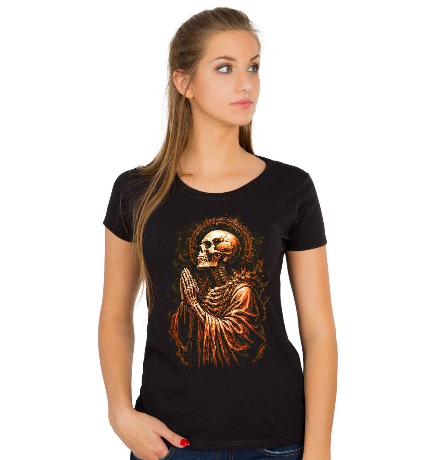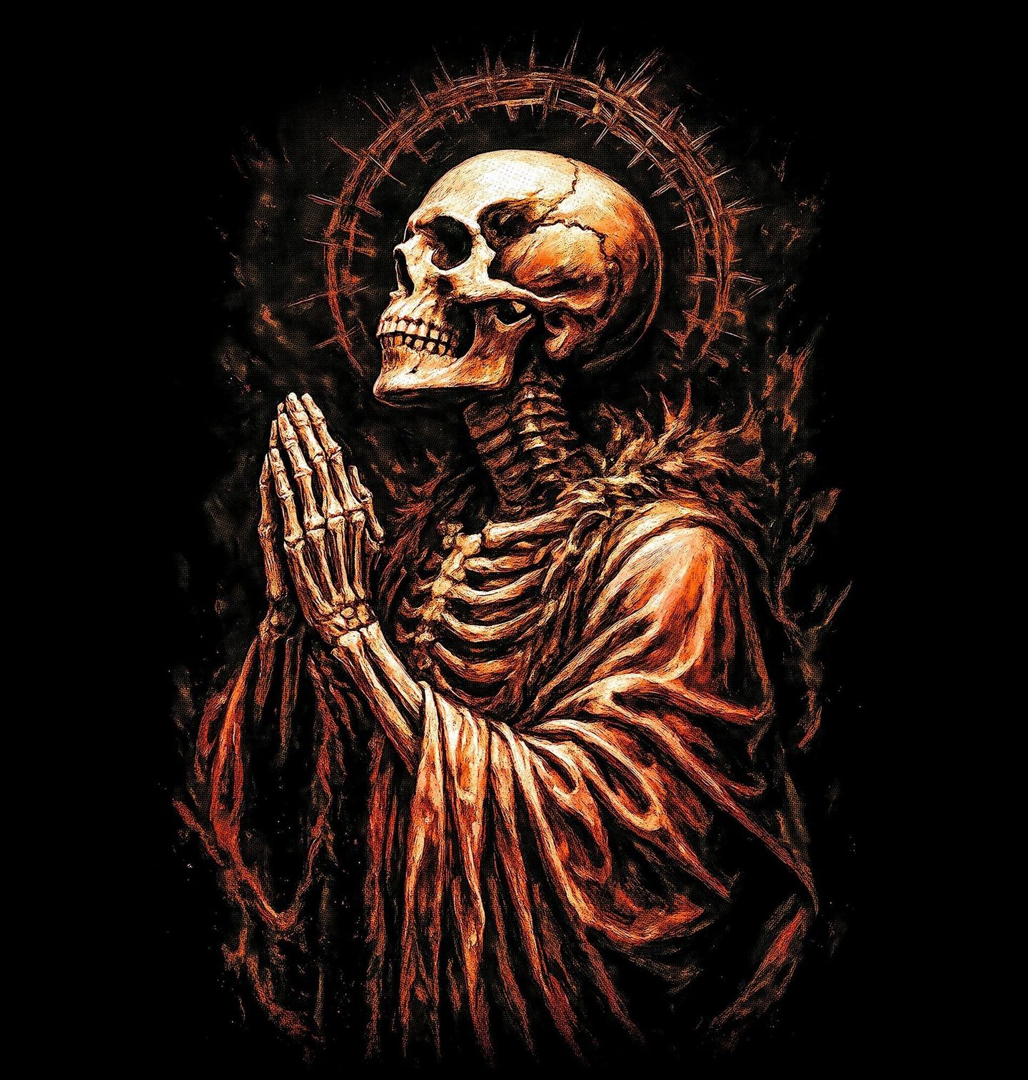 Dámské tričko Poslední Modlitba. Silný a emotivní motiv, kde kostlivec v tichém gestu skládá ruce k modlitba. Tento design symbolizuje pokání, víru a přechod mezi životem a smrtí. Temná atmosféra a výrazné detaily dodávají motivu hloubku a duchovní rozměr, který osloví milovníky gotiky, spirituality i symboliky věčnosti. Kostlivec zde nepůsobí děsivě, ale spíše jako připomínka klidu, smíření a poslední modlitby.