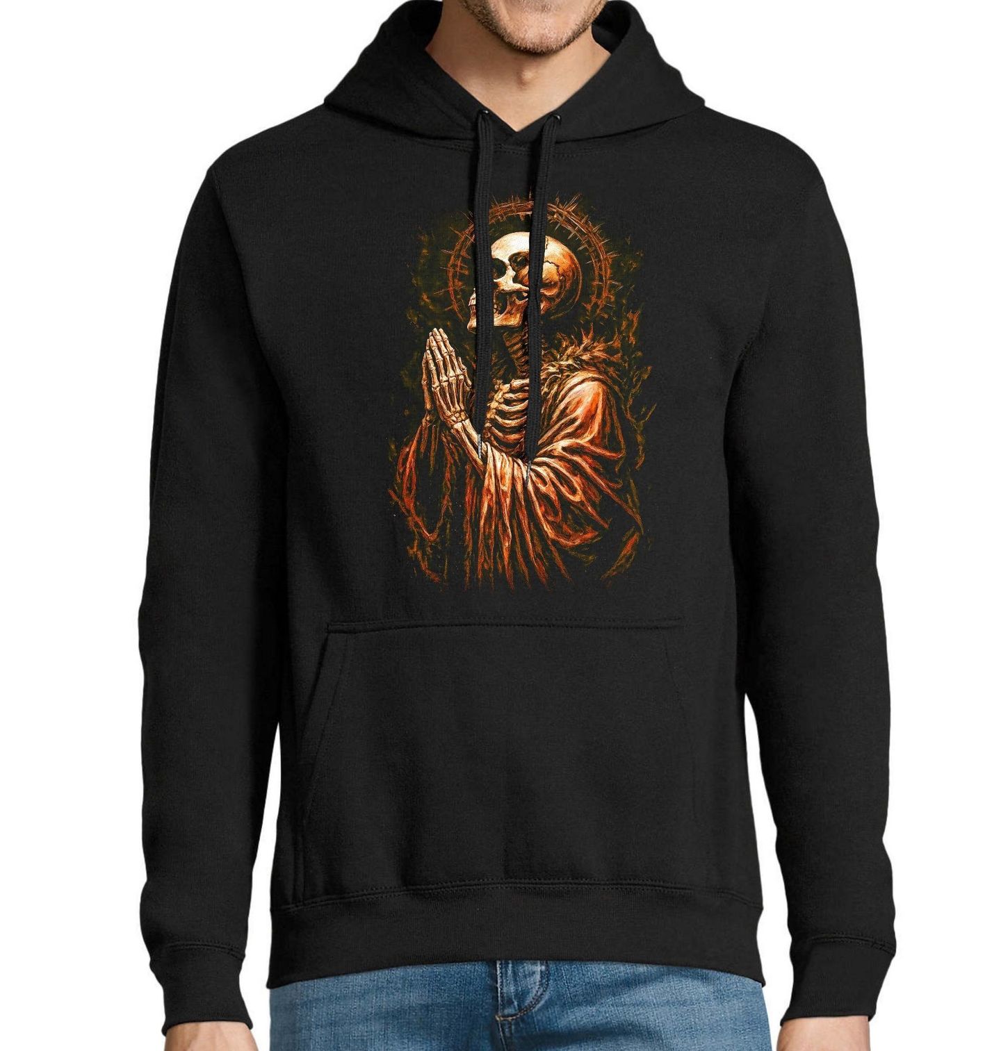 Pánská mikina Poslední Modlitba. Silný a emotivní motiv, kde kostlivec v tichém gestu skládá ruce k modlitba. Tento design symbolizuje pokání, víru a přechod mezi životem a smrtí. Temná atmosféra a výrazné detaily dodávají motivu hloubku a duchovní rozměr, který osloví milovníky gotiky, spirituality i symboliky věčnosti. Kostlivec zde nepůsobí děsivě, ale spíše jako připomínka klidu, smíření a poslední modlitby.