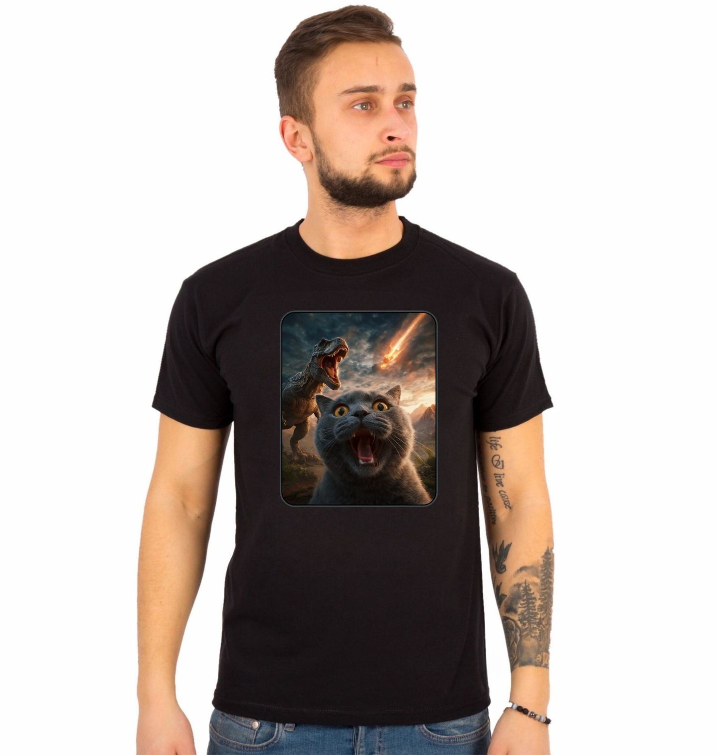 Pánské tričko Poslední Selfie Kočky a T-Rexe Pád Asteroidu. Motiv, který spojuje nečekanou dvojici – vyděšenou kočku a dinosaura T-Rexe sledujícího pád obrovského meteoritu. Kočka dodává obrázku vtip a nadsázku, zatímco dinosaurus T-Rex připomíná legendární historii.
