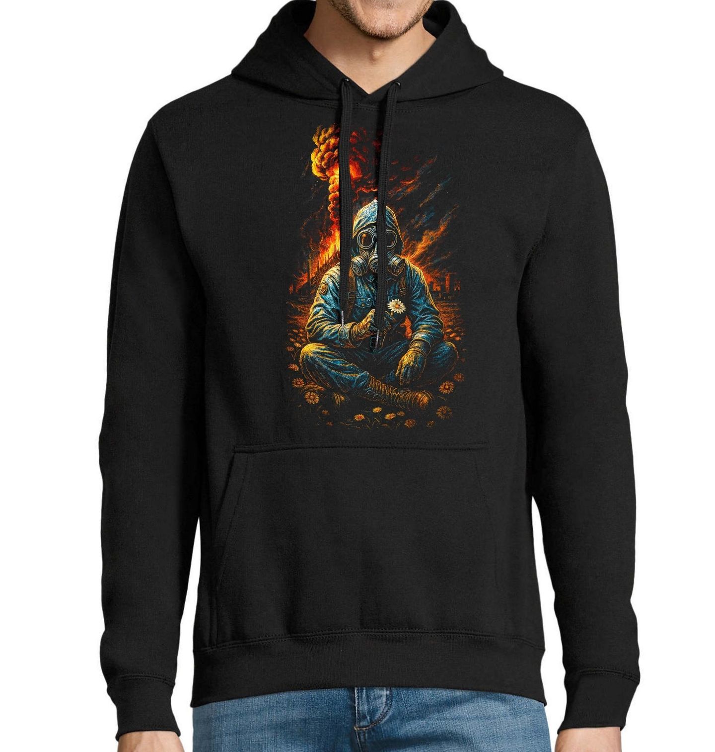 Pánská mikina Poslední Svědek Apokalypsy. Silný a kontrastní motiv zachycuje okamžik, kdy apokalypsa a konec světa už proběhly – a přesto v tichu trosek znovu vyrůstá život. Postava v masce sedí uprostřed zkázy, zatímco kolem ní kvetou jemné květiny, symbol naděje a nového začátku. Tento design spojuje temnotu s krásou a připomíná, že i po konci světa má příroda sílu znovu se probudit.