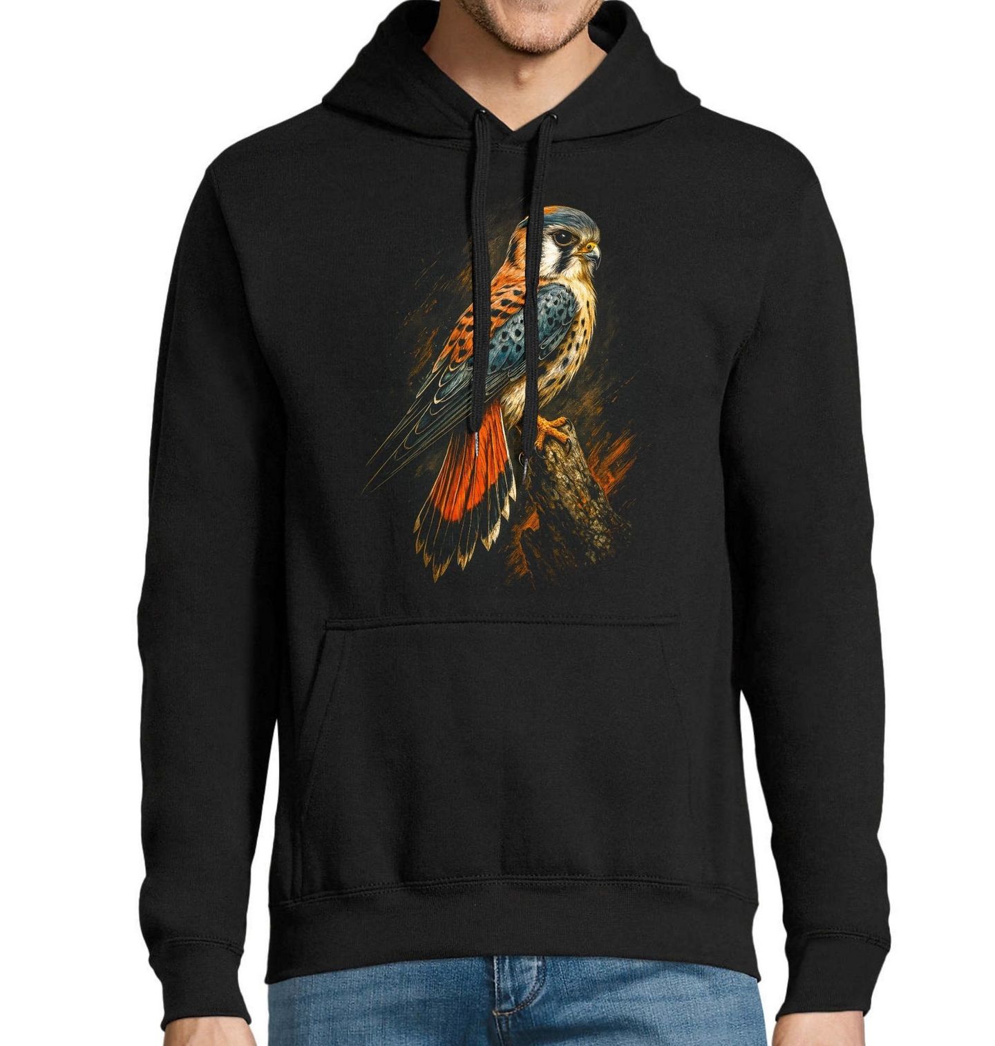 Pánská mikina Poštolka americká. Tento motiv zobrazuje ptáka poštolku pestrou, drobného sokolovitého dravce známého také jako American Kestrel (Falco sparverius). Tento pták je ideální volbou pro milovníky přírody, dravců a výrazných motivů s charakterem.