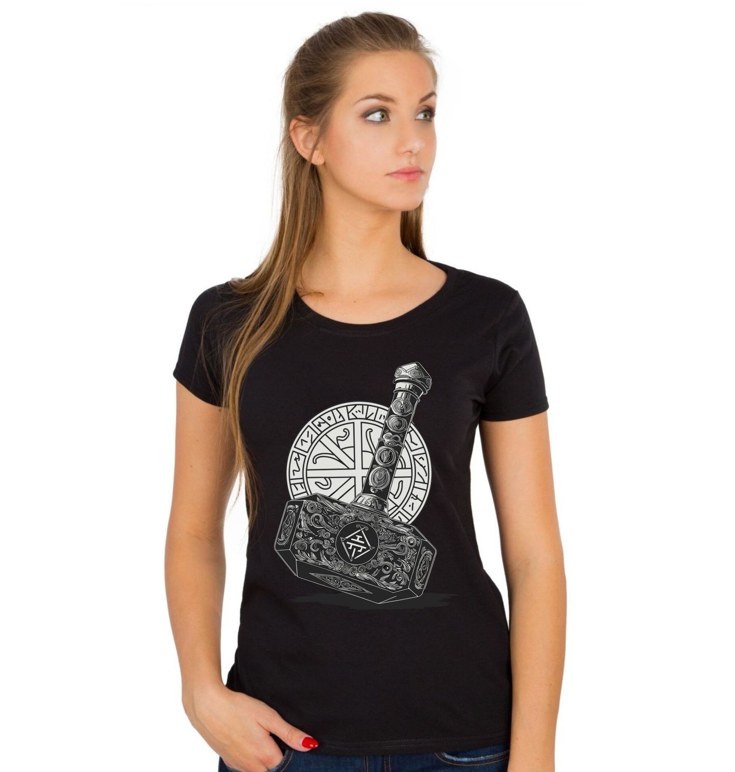 Dámské tričko Posvátné Kladivo Mjölnir. Silný severský motiv zobrazuje legendární kladivo Mjölnir, symbol boha Thóra, ochrany a ničivé síly blesku. Detailně zdobené vikingské kladivo je obklopeno runovým kruhem a nordskými ornamenty, které odkazují na víru, řád a duchovní ochranu světa lidí i bohů.