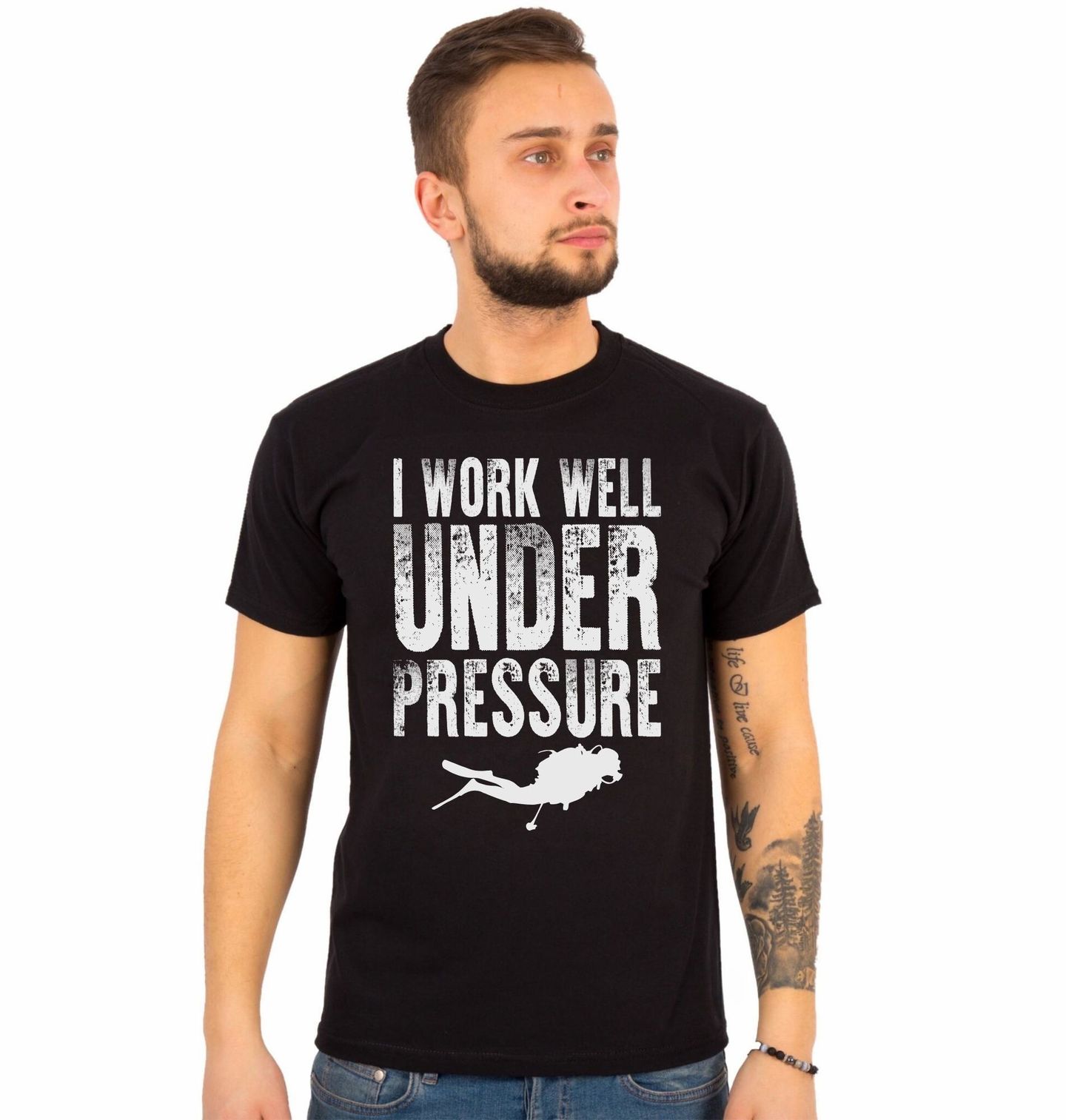 Pánské tričko Potápeč Tlak Mě Posiluje. Tento design s textem „I WORK WELL UNDER PRESSURE“ („Pracuji dobře pod tlakem“) v čistém stylu zdůrazňuje odhodlání a psychickou odolnost. Silueta potápěče dodává motivu dvojsmysl. Minimalistický design vhodný pro každodenní motivaci.