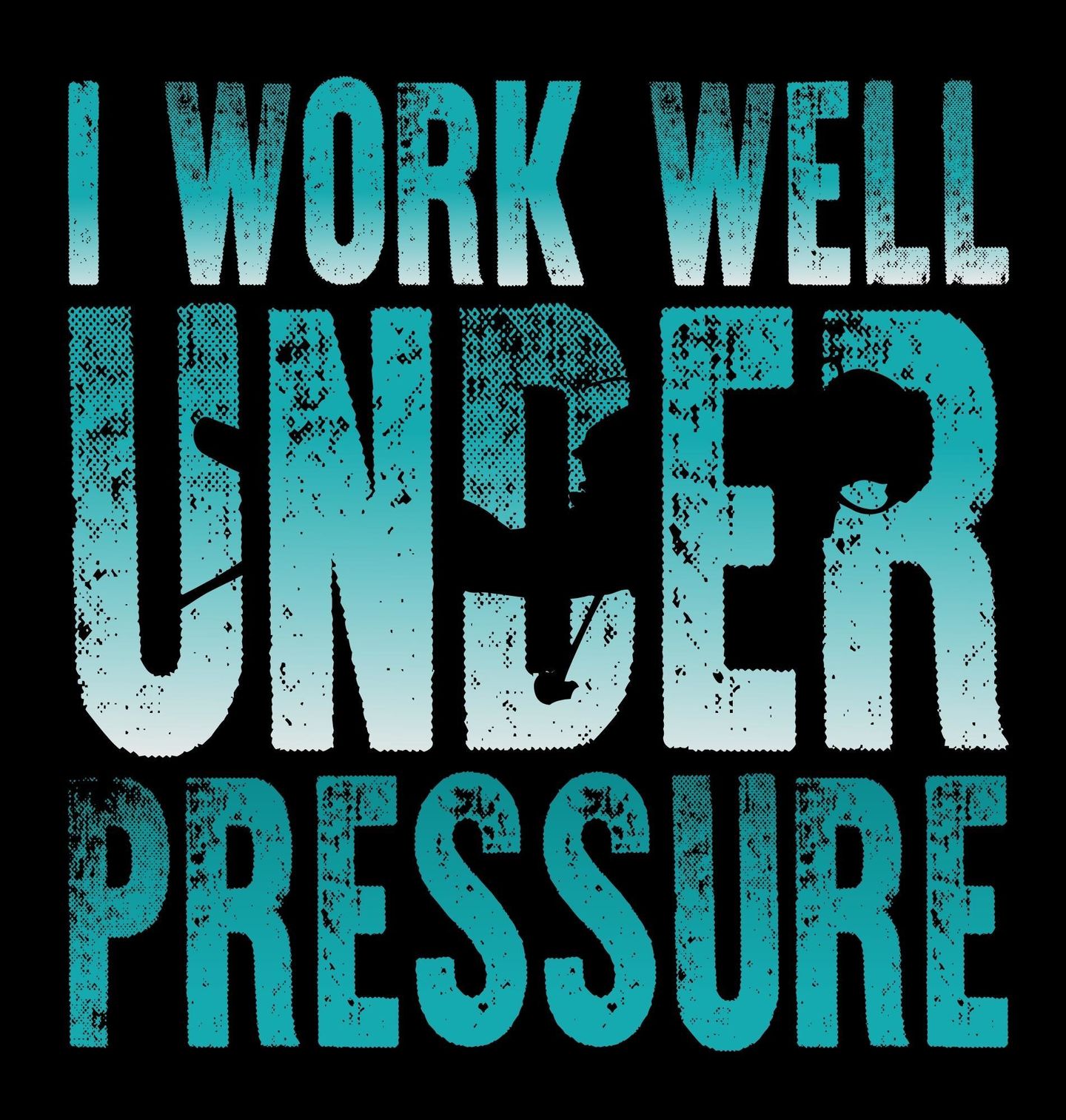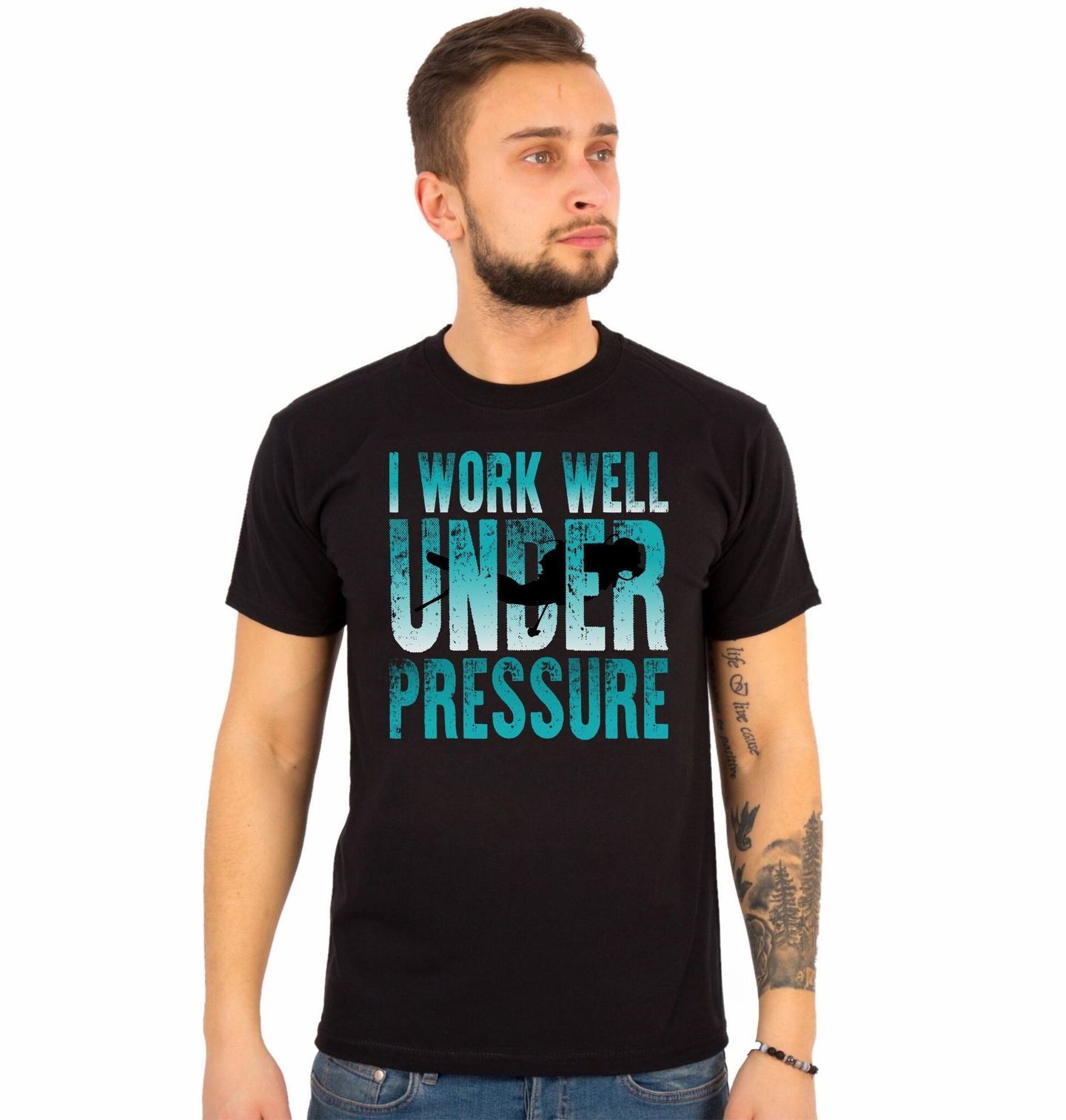 Pánské tričko Potápeč Tvrdá Práce pod Tlakem. Motivační design s výrazným nápisem „I WORK WELL UNDER PRESSURE“, což znamená „Pracuji dobře pod tlakem“. Perfektní pro ty, kteří zvládají stres a podávají nejlepší výkon právě v náročných situacích. Silný a sebevědomý design.