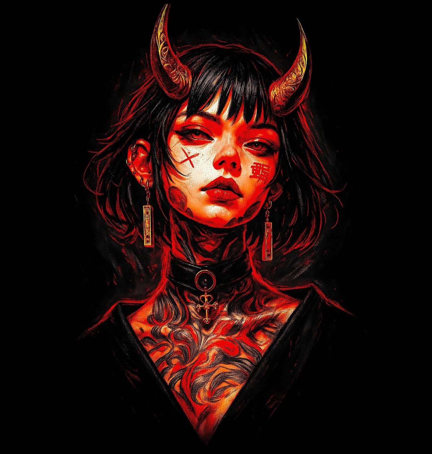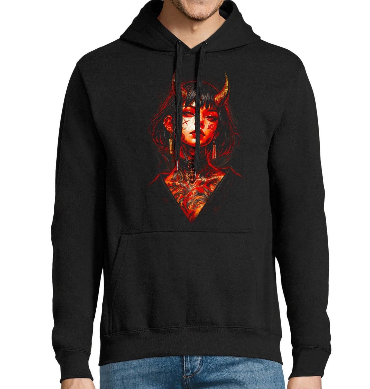 Pánská mikina Potetovaná Ďáblice z Tokia. Temná krása, rebelie a tajemství – tento výrazný motiv zobrazuje ďáblice inspirovanou estetikou Japonsko a moderním street artem. Kombinace rohů, intenzivního pohledu a detailního tetování vytváří silný vizuální příběh plný kontrastů mezi krásou a temnotou. Motiv čerpá z japonské kultury, kde se prolíná tradice s moderním stylem. Precizně zpracované tetování dodává postavě hloubku, charakter a jedinečný rukopis, který okamžitě upoutá pozornost.