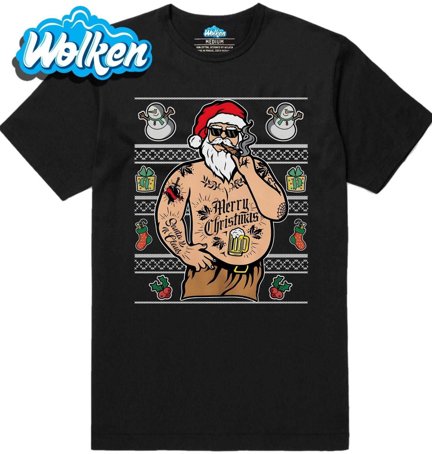 Pánské tričko Potetovaný Santa Claus. Připravte se na sváteční revoluci s tímto nekonvenčním kouskem! Tento ugly sweater přináší originální a zábavný motiv: potetovaného Santy, který s doutníkem v ruce, pivem na břiše a nápisem „Merry Christmas“ ukazuje, že Vánoce nemusí být jen o punči a pohádkách.
