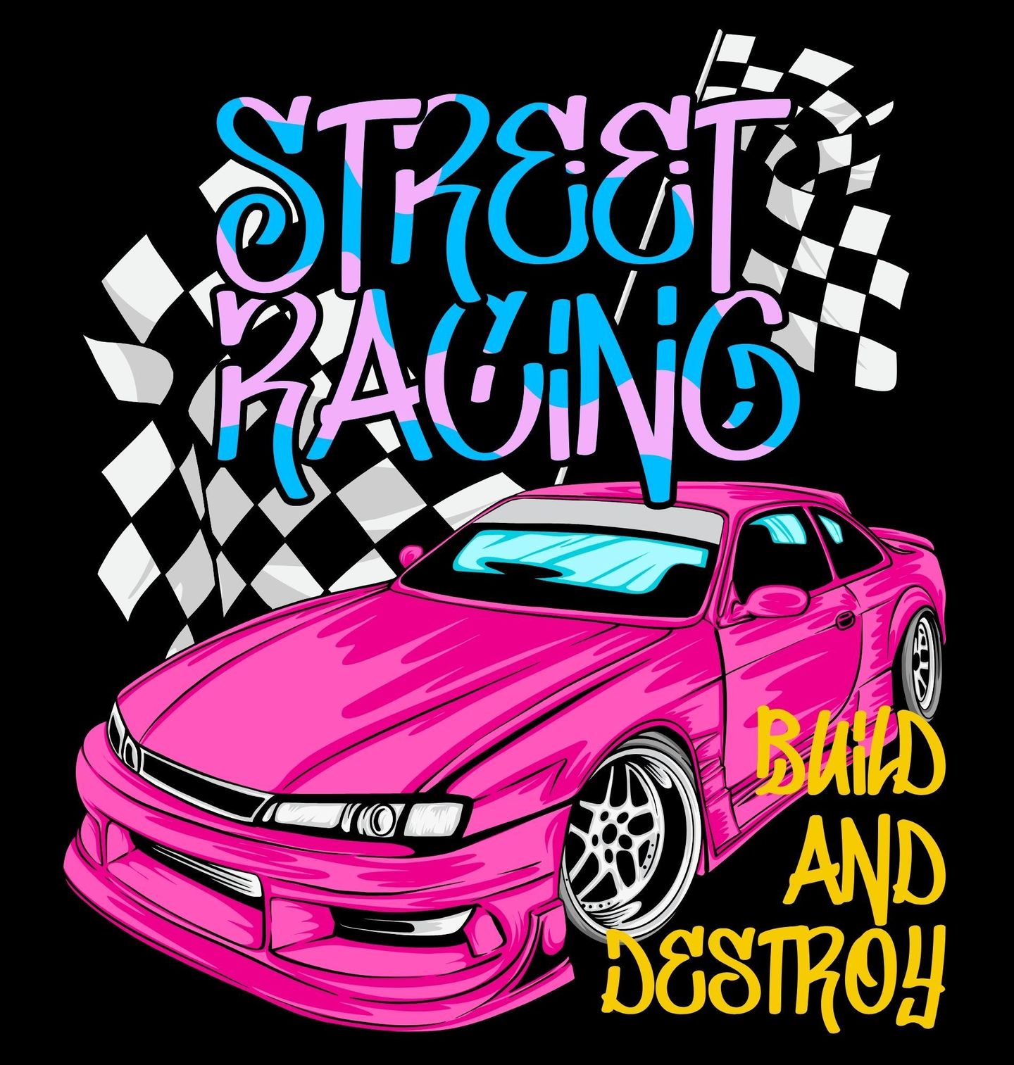 Dámské tričko Pouliční Závodění Street Racing. Růžové závodní auto, šachovnicová vlajka a graffiti nápisy „Street Racing“ a „Build and Destroy“ je ideální pro fanoušky pouličních závodů i driftování. Auto na motivu vizuálně nejvíce připomíná Nissan Silvia S14 – ikonické japonské sportovní auto ze 90. let, oblíbené v tuningové a driftovací komunitě.