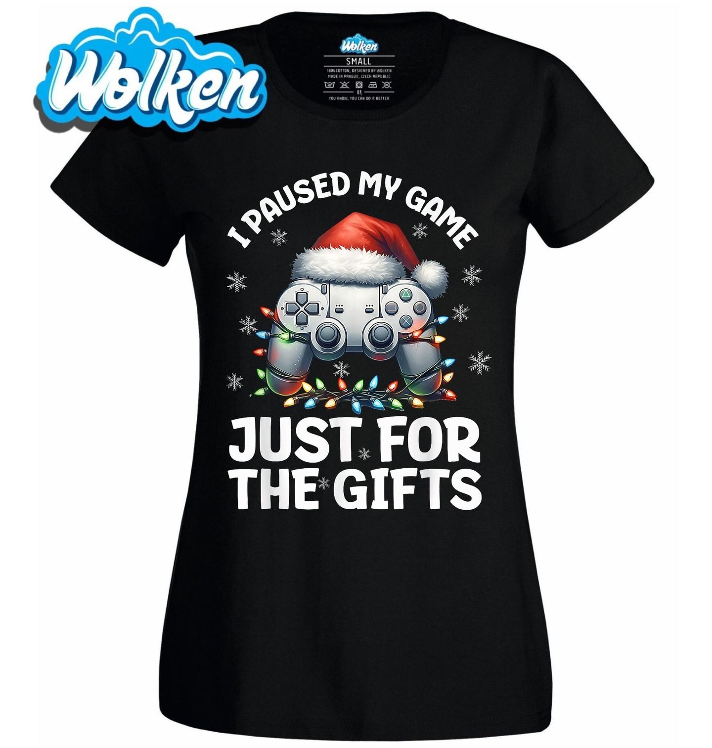 Dámské tričko Pozastavil jsem svou hru jen kvůli dárkům. "I paused my game just for the gifts" – přeloženo: „Pozastavil jsem svou hru jen kvůli dárkům.“ Tak přesně tohle říká každý správný hráč, když ho vyrušíš u oblíbených videoher během Vánoc! Stylový motiv s herním ovladačem ozdobeným vánoční čepicí a světýlky potěší každého fanouška konzolí i počítačových her.