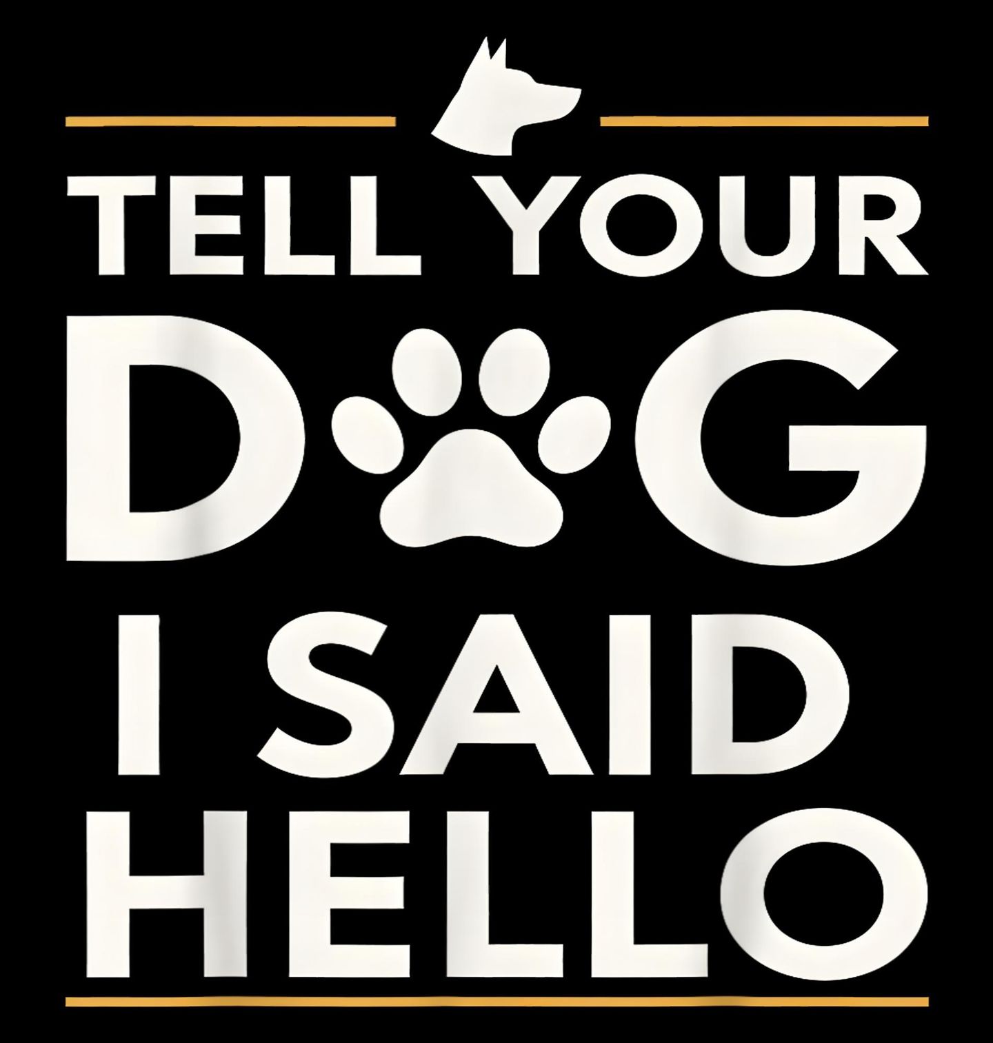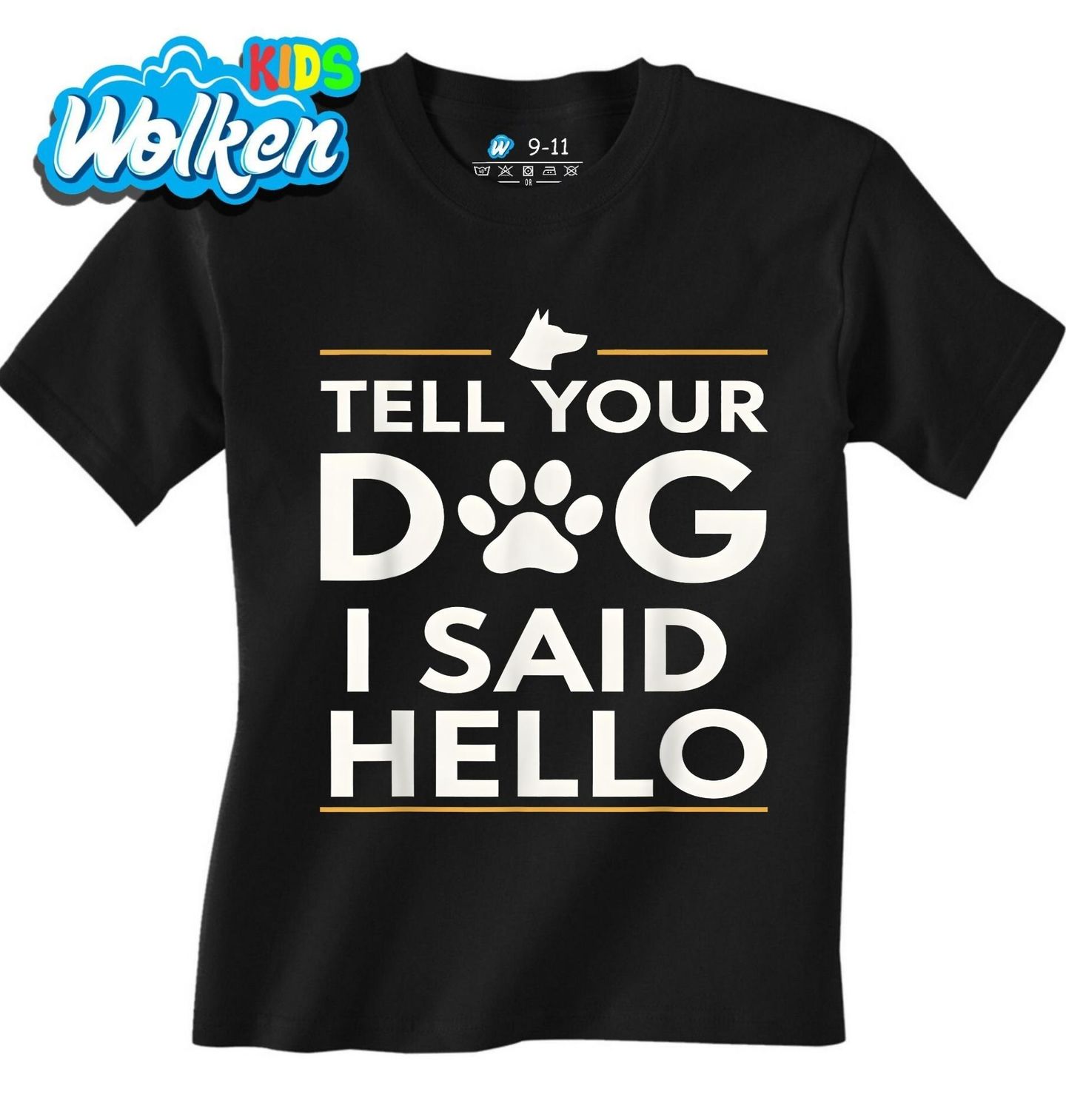 Dětské tričko Pozdravuj svého psa. „Tell your dog I said hello“ („Řekni svému psovi, že ho zdravím“) doplněný o siluetu psí hlavy a tlapku okamžitě pobaví každého pejskaře a ukáže, že pes je pro vás víc než jen domácí mazlíček – je to člen rodiny.