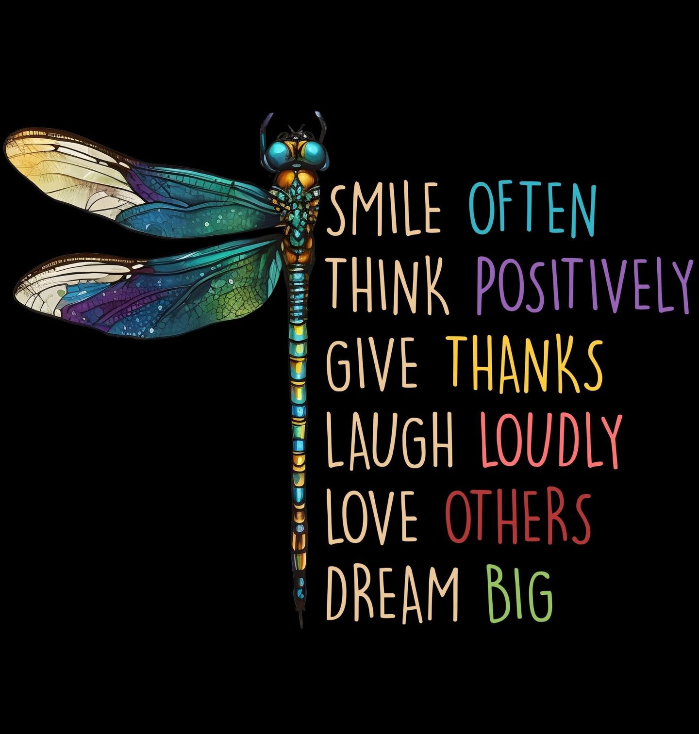Dámské tričko Pozitivní Vážka Smile Often. Vážka symbolizuje lehkost, změnu a radost, což dokonale ladí s poselstvím celého designu. Text na motivu zní: „Smile often, think positively, give thanks, laugh loudly, love others, dream big“ což v překladu znamená: „Často se usmívej, mysli pozitivně, buď vděčný, směj se nahlas, miluj ostatní, sněte ve velkém.“