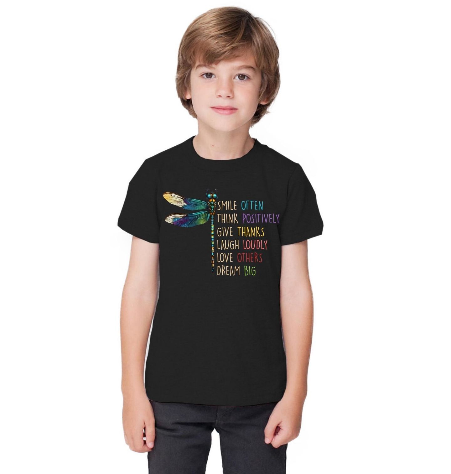 Dětské tričko Pozitivní Vážka Smile Often. Vážka symbolizuje lehkost, změnu a radost, což dokonale ladí s poselstvím celého designu. Text na motivu zní: „Smile often, think positively, give thanks, laugh loudly, love others, dream big“ což v překladu znamená: „Často se usmívej, mysli pozitivně, buď vděčný, směj se nahlas, miluj ostatní, sněte ve velkém.“