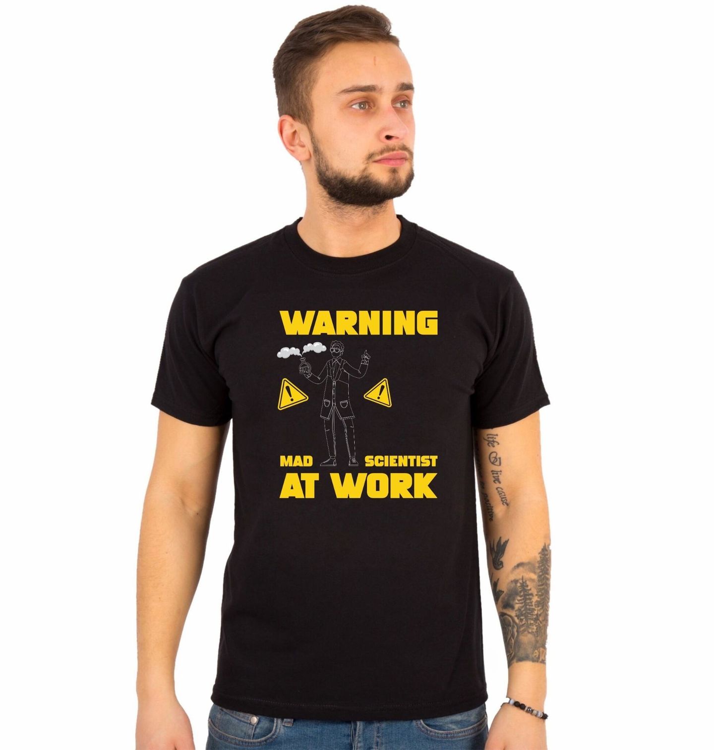 Pánské tričko Pozor! Šílený chemik v práci. Originální a zábavný motiv s textem „WARNING MAD SCIENTIST AT WORK“ zaujme každého, koho baví chemie, věda a experimentování. Překlad nápisu zní: „Pozor! Šílený vědec při práci“, což skvěle vystihuje hravý charakter designu. Tento motiv je ideální pro každého, kdo se cítí jako chemik, miluje laboratorní prostředí a rád ukazuje svou vášeň pro věda s nadhledem.