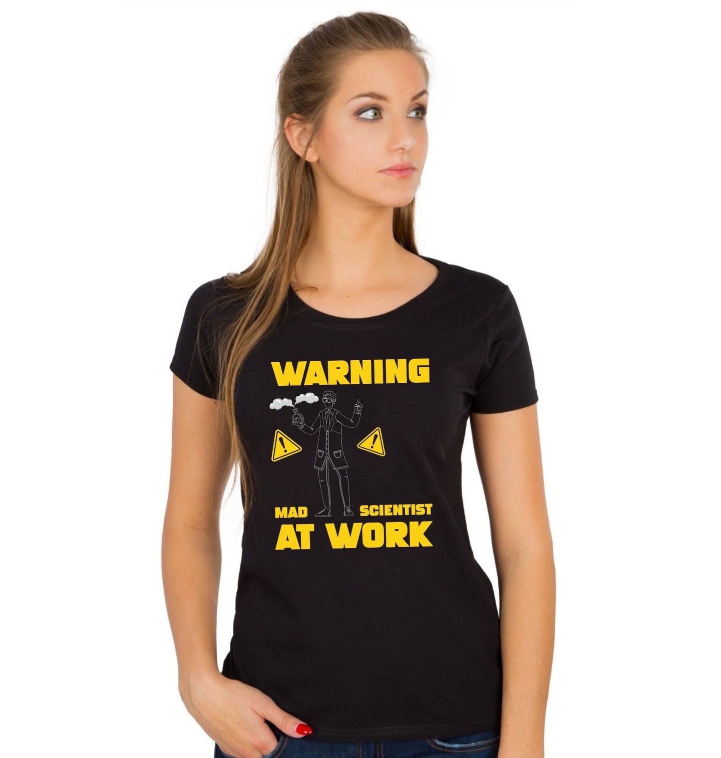 Dámské tričko Pozor! Šílený chemik v práci. Originální a zábavný motiv s textem „WARNING MAD SCIENTIST AT WORK“ zaujme každého, koho baví chemie, věda a experimentování. Překlad nápisu zní: „Pozor! Šílený vědec při práci“, což skvěle vystihuje hravý charakter designu. Tento motiv je ideální pro každého, kdo se cítí jako chemik, miluje laboratorní prostředí a rád ukazuje svou vášeň pro věda s nadhledem.