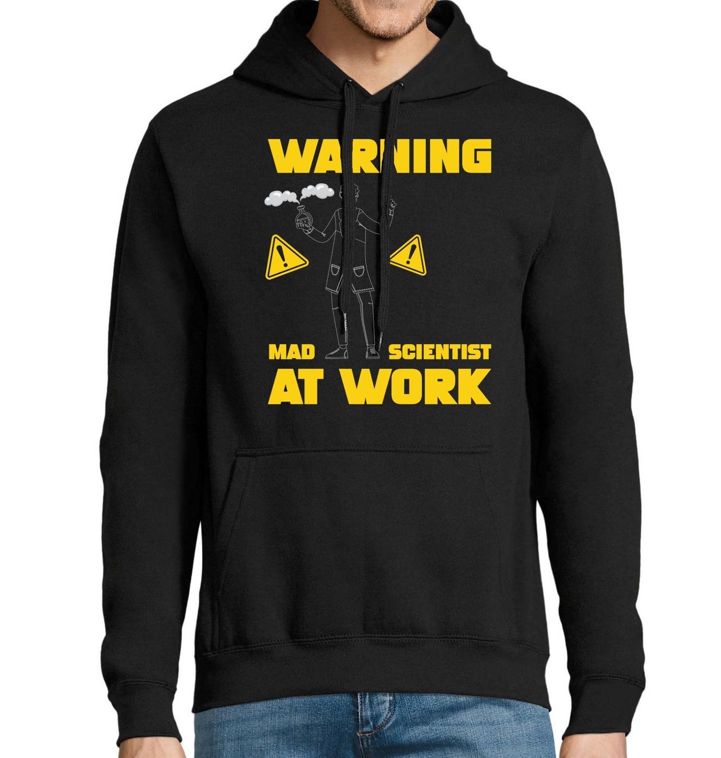 Pánská mikina Pozor! Šílený chemik v práci. Originální a zábavný motiv s textem „WARNING MAD SCIENTIST AT WORK“ zaujme každého, koho baví chemie, věda a experimentování. Překlad nápisu zní: „Pozor! Šílený vědec při práci“, což skvěle vystihuje hravý charakter designu. Tento motiv je ideální pro každého, kdo se cítí jako chemik, miluje laboratorní prostředí a rád ukazuje svou vášeň pro věda s nadhledem.