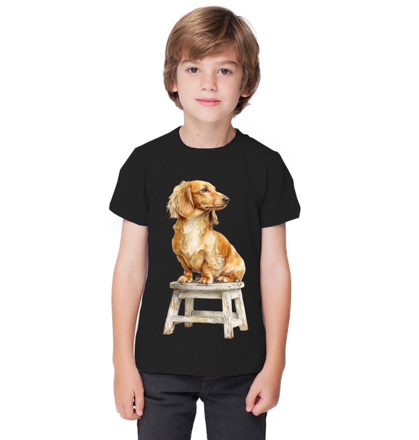Dětské tričko Pózující Jezevčík na Stoličce. Tenhle pes přesně ví, kdy je čas zapnout pózovací mód. Elegantní jezevčík sedí na stoličce, hlavu lehce stranou, výraz „klidně foť, jsem připraven“. Každý pejskař ten moment zná – pes, který se tváří, jako by byl zvyklý stát před objektivem celý život. Ideální pro milovníky psů, kteří ocení psí eleganci.