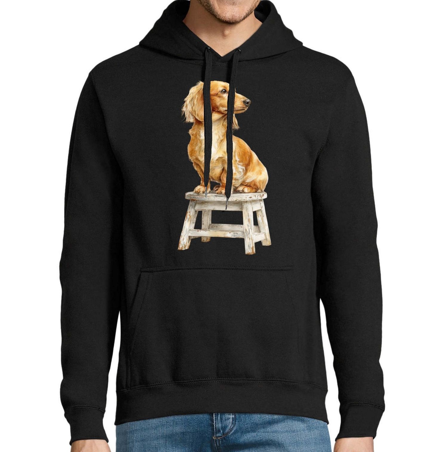 Pánská mikina Pózující Jezevčík na Stoličce. Tenhle pes přesně ví, kdy je čas zapnout pózovací mód. Elegantní jezevčík sedí na stoličce, hlavu lehce stranou, výraz „klidně foť, jsem připraven“. Každý pejskař ten moment zná – pes, který se tváří, jako by byl zvyklý stát před objektivem celý život. Ideální pro milovníky psů, kteří ocení psí eleganci.