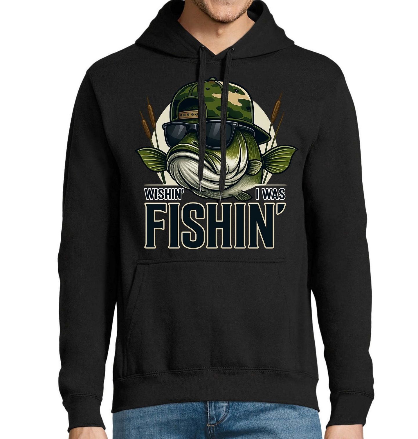 Pánská mikina Přání Každého Rybáře. Vtipný a stylový motiv s ilustrací ryby zachycuje pohodu, kterou přináší rybaření, a potěší každého, kdo miluje ryby a život u vody. Design doplňuje anglický text „Wishin’ I Was Fishin’“, což v překladu znamená „Kéž bych byl na rybách.“ Ideální pro každého, kdo je srdcem rybář a ví, že nejlepší chvíle přichází právě tehdy, když je rybaření na prvním místě.