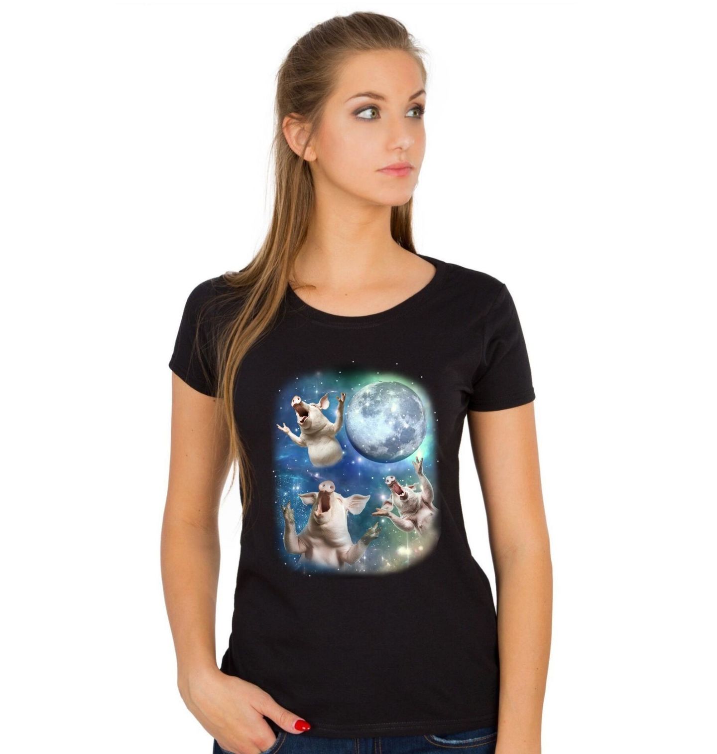 Dámské tričko Prasata vyjící na Měsíc. Parodický motiv na kultovní design „Three Wolf Moon“. Místo vlků zde v úžasné vesmírné scenérii vyjí tři prasata směrem k magickému úplňku. Ideální pro fanoušky meme kultury, zvířecí recese i každého, kdo ocení bizarní kombinaci prase + měsíc + vesmír.
