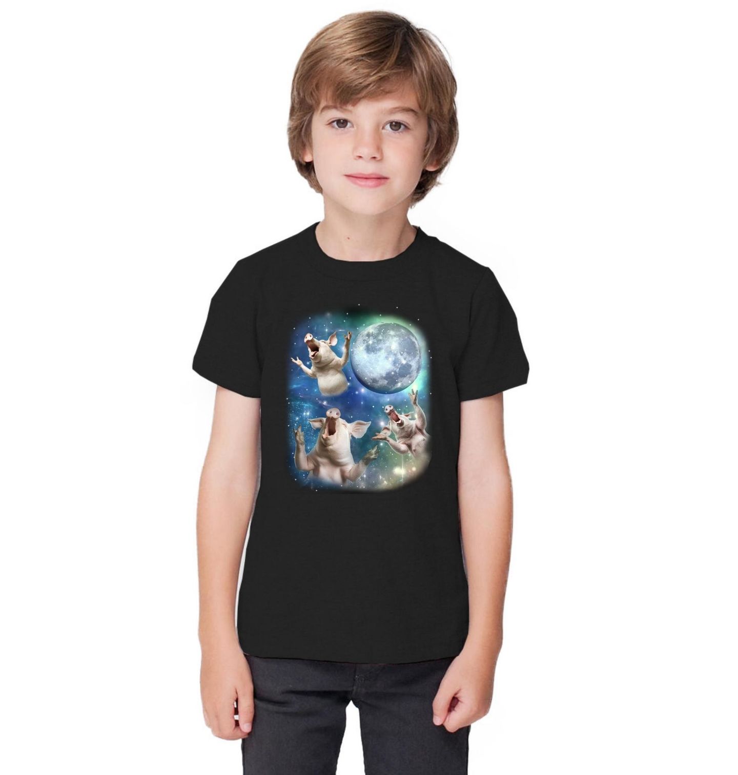 Dětské tričko Prasata vyjící na Měsíc. Parodický motiv na kultovní design „Three Wolf Moon“. Místo vlků zde v úžasné vesmírné scenérii vyjí tři prasata směrem k magickému úplňku. Ideální pro fanoušky meme kultury, zvířecí recese i každého, kdo ocení bizarní kombinaci prase + měsíc + vesmír.