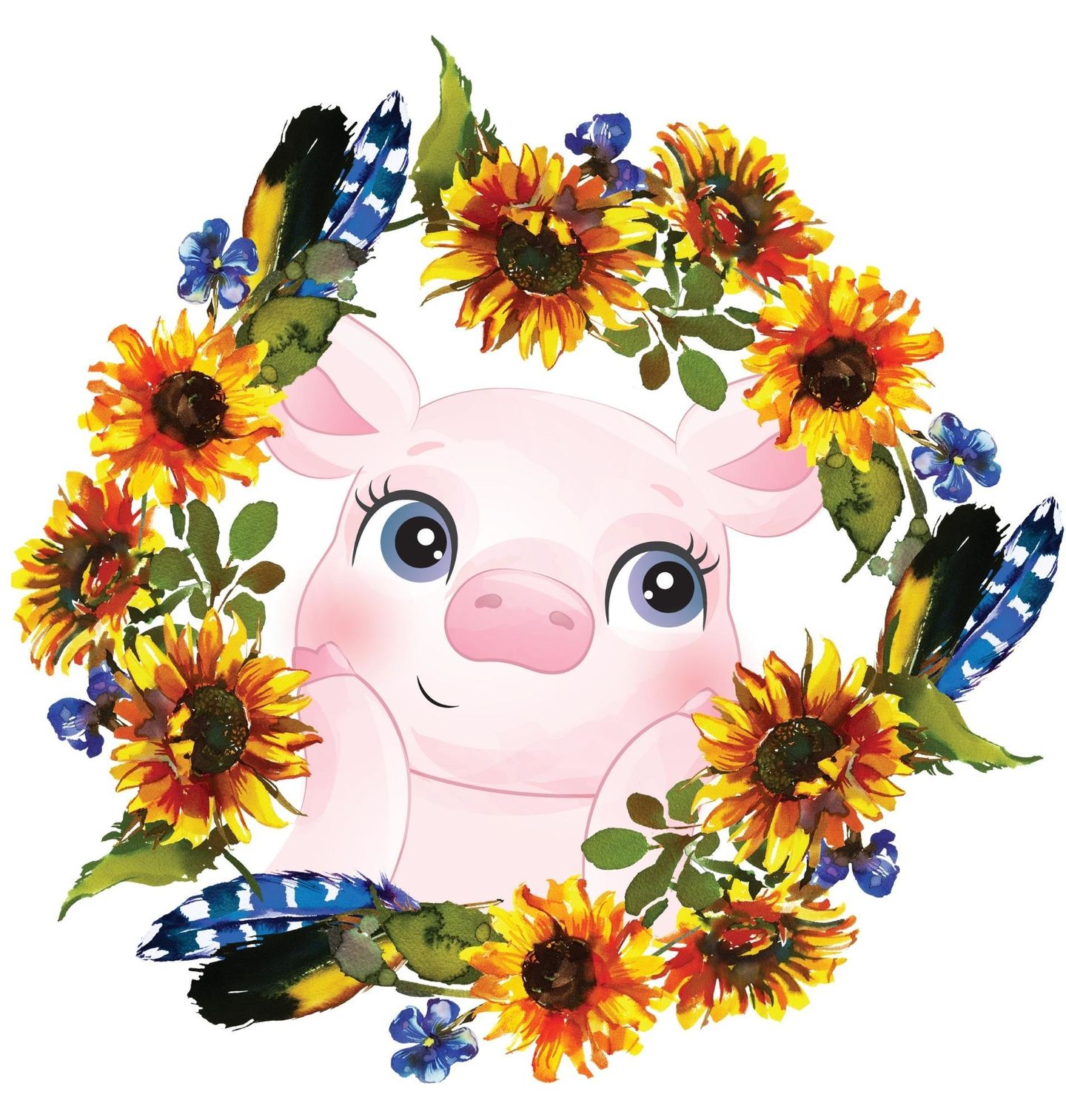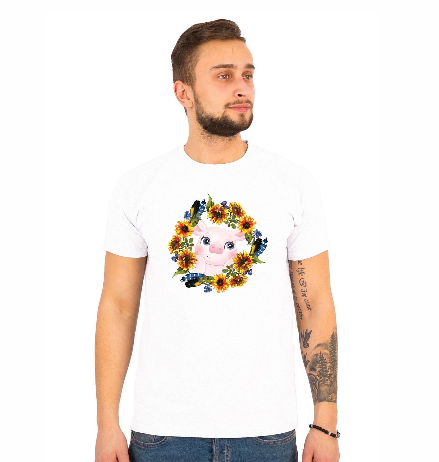 Pánské tričko Prasátko v Květinovém Věnci. Veselý a roztomilý motiv, na kterém je prase obklopené bohatým květinovým věncem. Motiv připomíná, že farma je místo, kde mají zvířata i příroda své místo. Květiny dodávají obrázku lehkost, barvy a radostnou atmosféru. Dominantní roli hrají slunečnice, které dodávají ilustraci letní atmosféru.