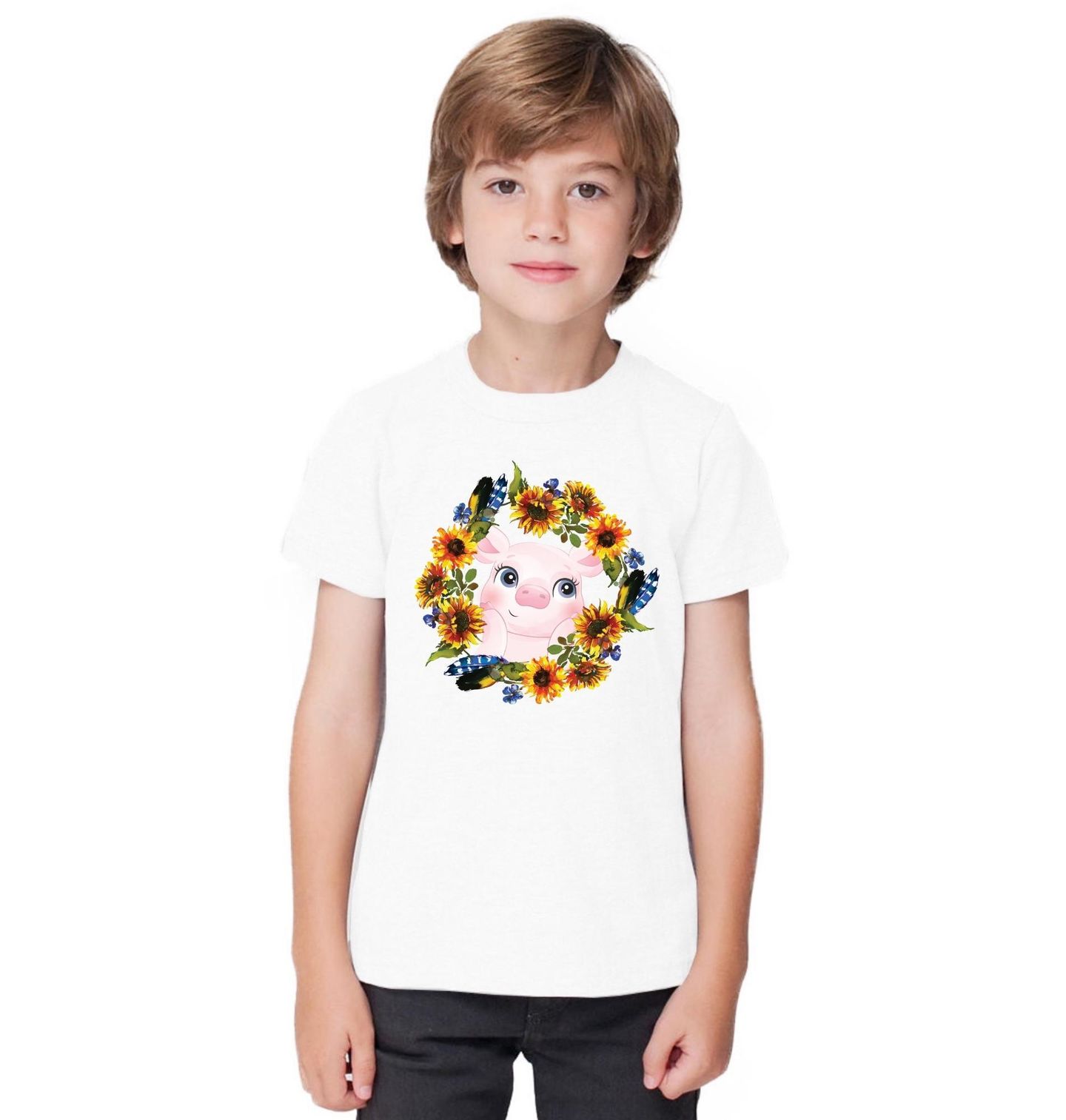 Dětské tričko Prasátko v Květinovém Věnci. Veselý a roztomilý motiv, na kterém je prase obklopené bohatým květinovým věncem. Motiv připomíná, že farma je místo, kde mají zvířata i příroda své místo. Květiny dodávají obrázku lehkost, barvy a radostnou atmosféru. Dominantní roli hrají slunečnice, které dodávají ilustraci letní atmosféru.
