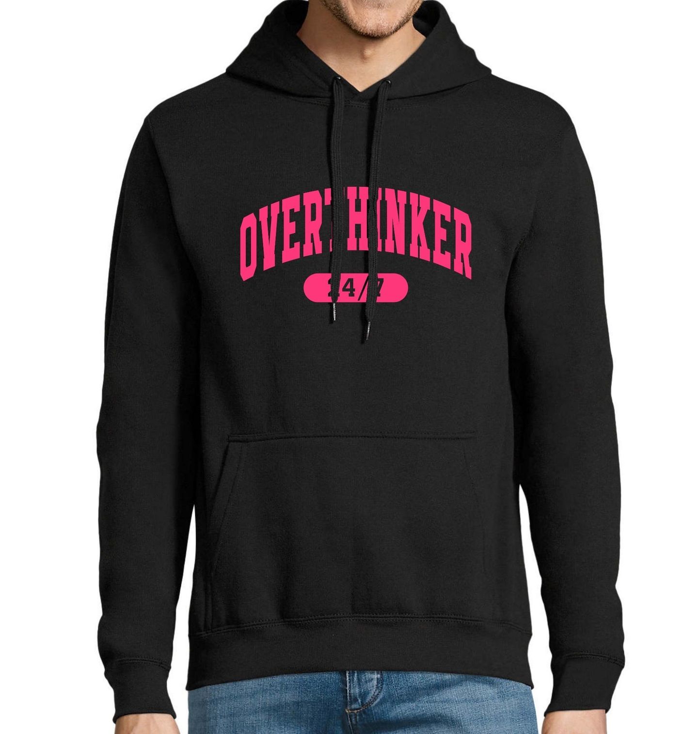 Pánská mikina Přemýšlím Nonstop Overthinker 24/7. Pro ty, kteří nikdy neodpočívají od myšlenek, kteří neustále analyzují každý detail a přemýšlejí o všem, co se děje. Pro každého přemýšlivce, který je 'on' ve dne v noci – 24 hodin denně, 7 dní v týdnu.