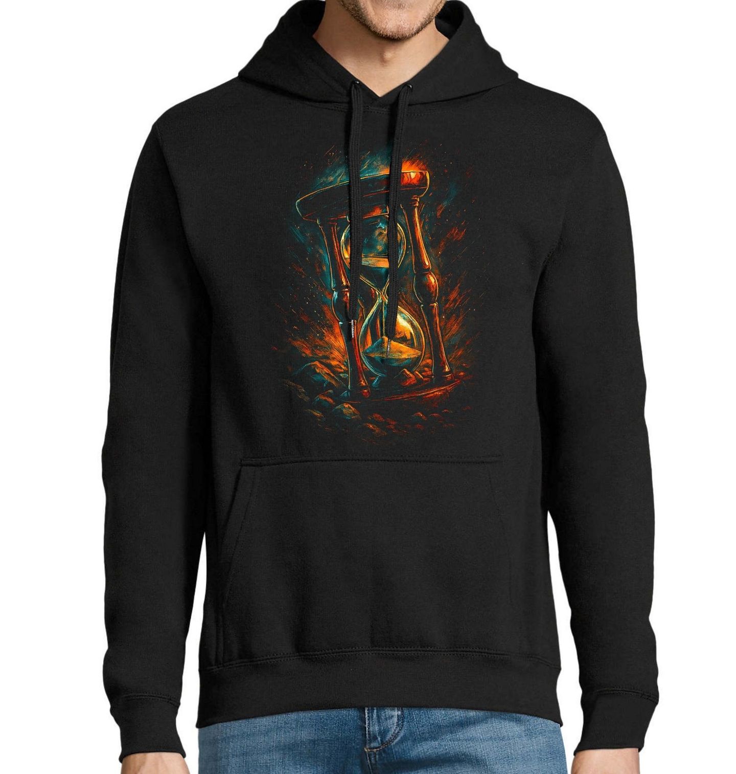 Pánská mikina Přesýpací Hodiny. Silný a nadčasový motiv, který zachycuje neúprosný tok, jakým plyne čas. Přesýpací hodiny zde symbolizují pomíjivost, rozhodnutí i hodnotu každého okamžiku. Dynamické barvy a dramatické zpracování dávají motivu energii, která zaujme na první pohled. Ideální volba pro všechny, kdo si váží času, hledají motivaci nebo chtějí nosit design s filozofickým přesahem.