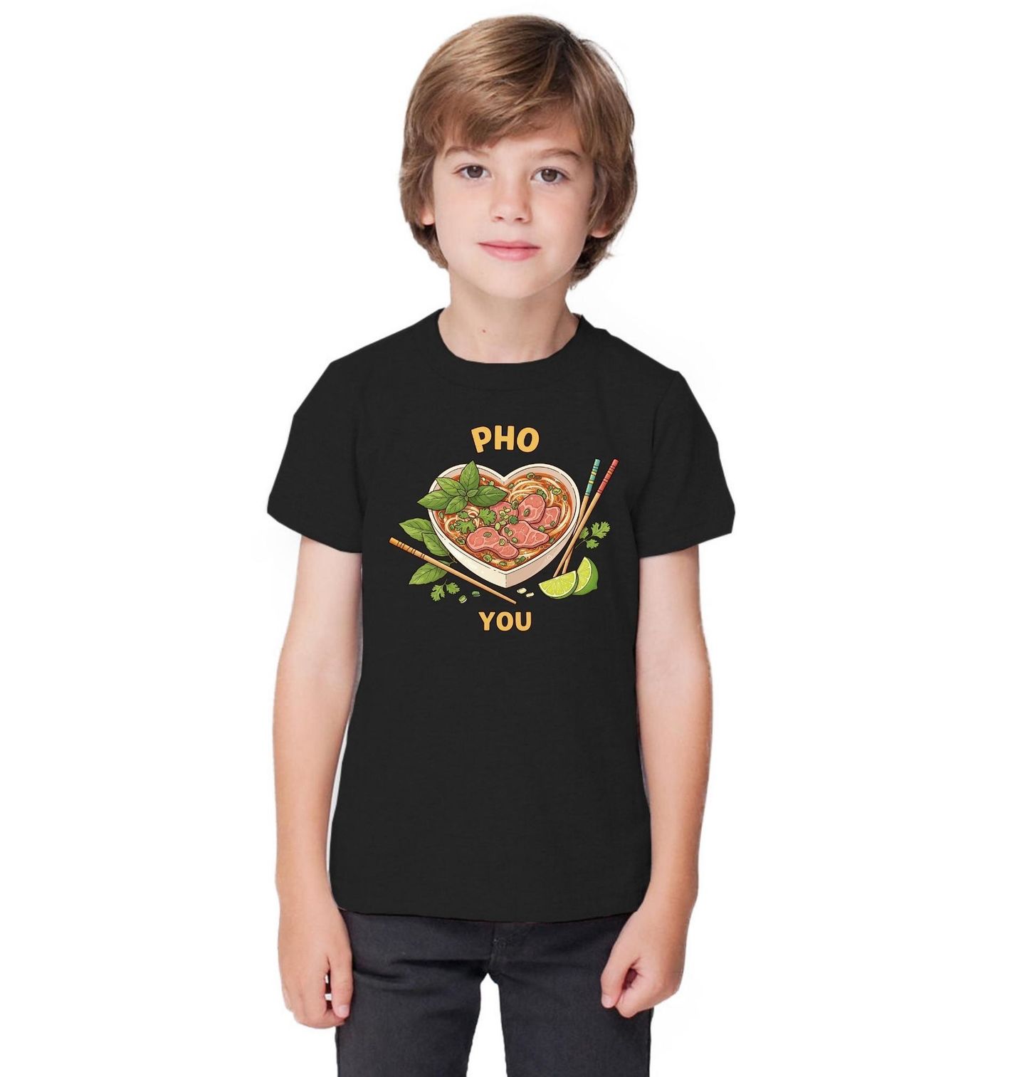 Dětské tričko Pro tebe Pho You. Roztomilý design s vietnamskou polévkou pho ve tvaru srdce doplněný textem „Pho You“, což je slovní hříčka znamenající „Pro tebe“. Kombinace bylinek, limetky a nudlí vytváří chutný vizuální zážitek. Tento design je perfektní pro milovníky asijské kuchyně i romantických motivů.