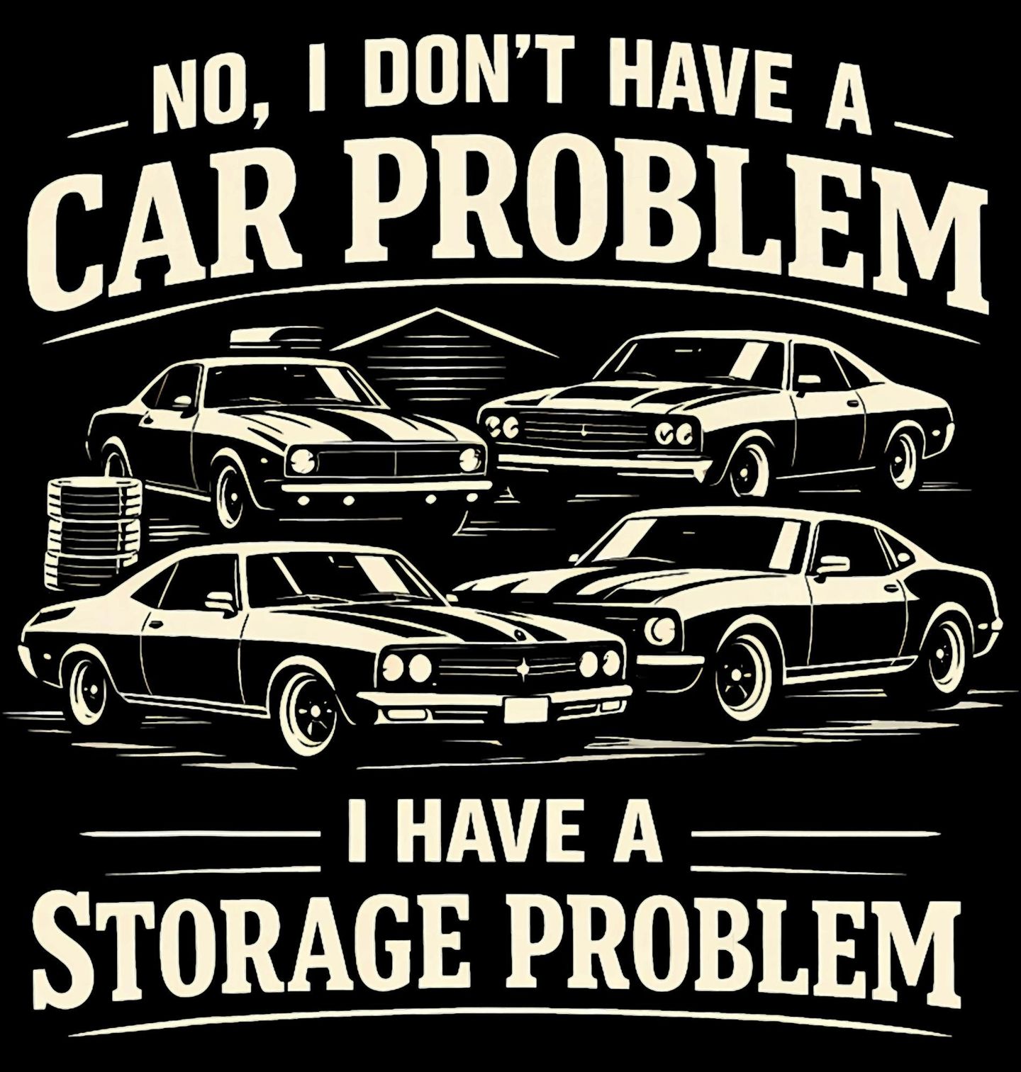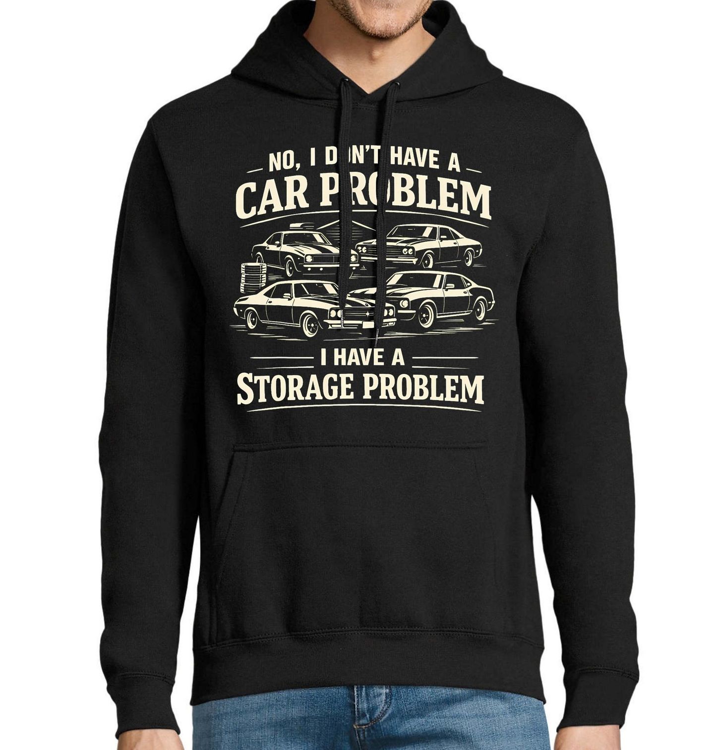 Pánská mikina Problém je Jen Místo v Garáži. Tento stylový design potěší každého milovníka aut. Nápis „No, I don’t have a car problem. I have a storage problem.“ znamená „Ne, nemám problém s auty. Mám problém s místem.“ Perfektní motiv pro všechny, kteří vědí, že aut není nikdy dost – jen garáž je malá.